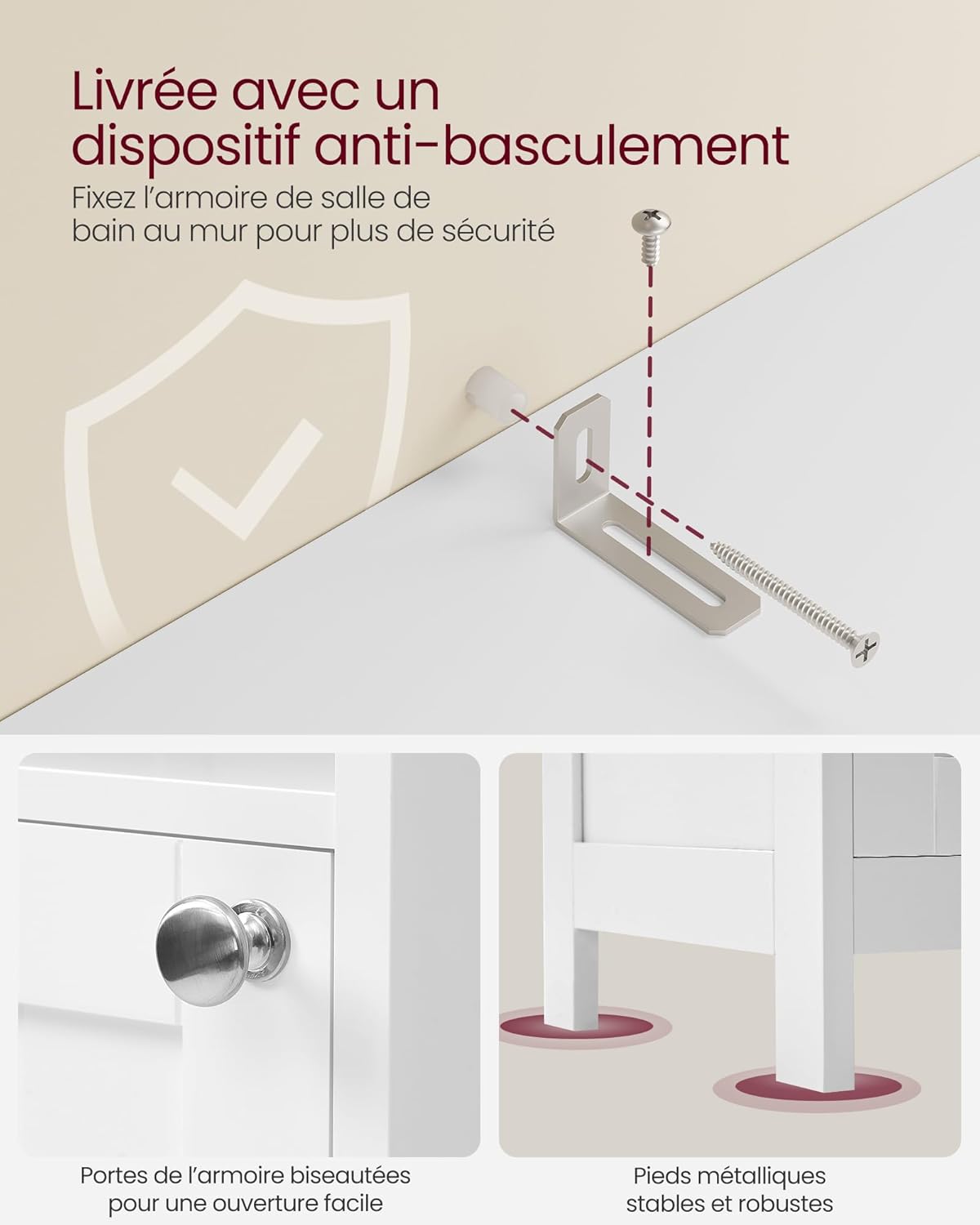 De kast is gemaakt van hoogwaardig gelakt MDF, eenvoudig schoon te maken en bestand tegen vochtige omgevingen. Met de meegeleverde kantelbeveiliging kun je de kast stevig aan de muur bevestigen voor extra veiligheid.