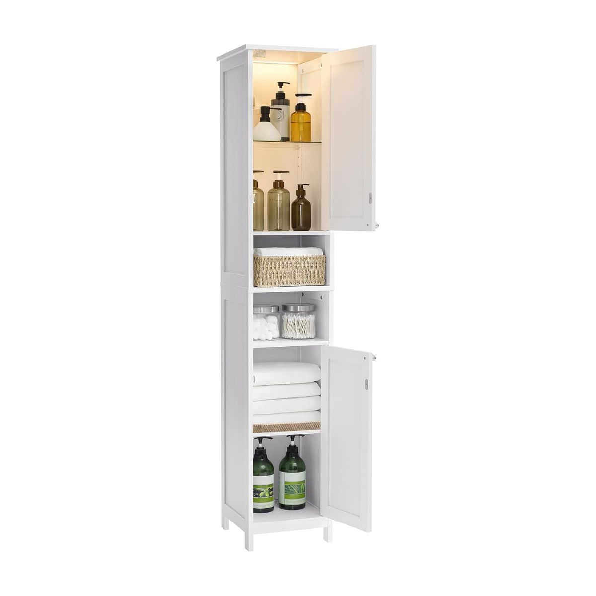 Zowel het bovenste als onderste compartiment bevat een in hoogte verstelbare plank met vijf standen. Zo pas je de indeling eenvoudig aan op jouw opbergbehoeften, van handdoeken tot flessen en verzorgingsproducten.