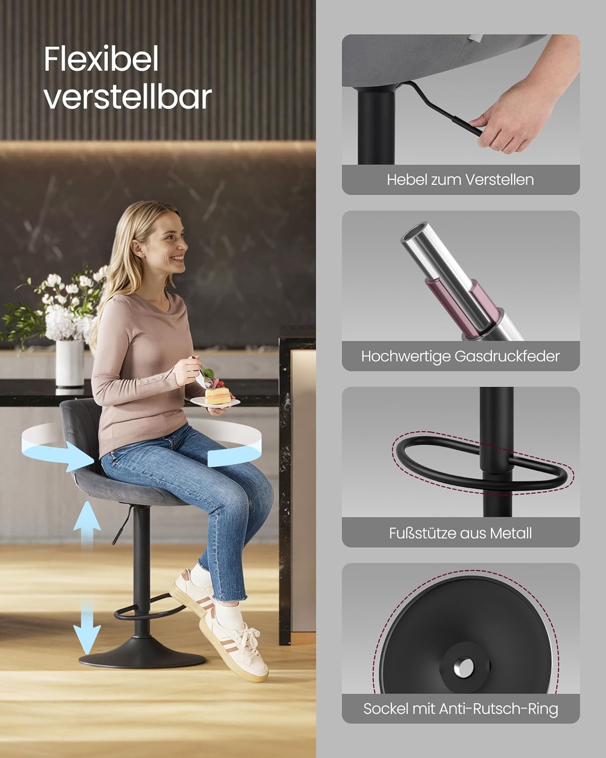 De barkrukken zijn traploos in hoogte verstelbaar tussen 60 en 80 cm en kunnen 360° draaien, zodat je altijd de ideale zithouding vindt – of het nu aan de bar, het keukeneiland of de hoge tafel is.