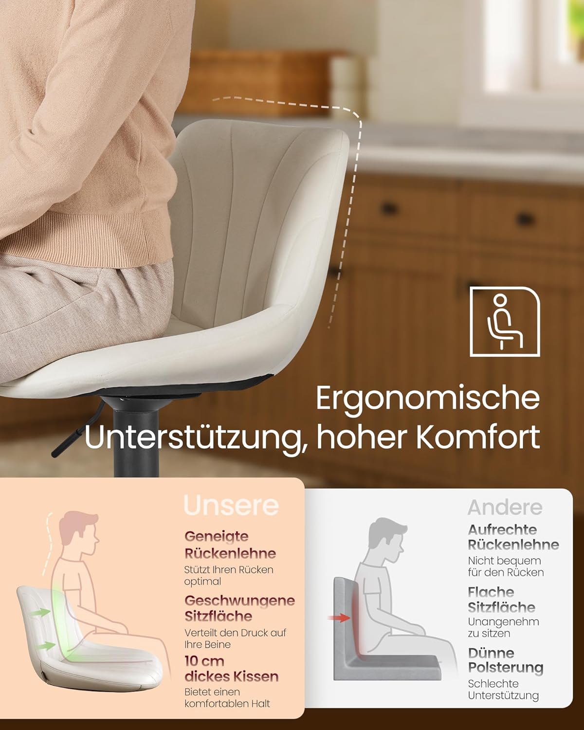 Elke kruk is voorzien van een rugleuning van 28 cm hoog en een zitdiepte van 38 cm, waardoor je geniet van optimaal comfort en ondersteuning. Perfect voor ontspannen ontbijten, gezellig borrelen of comfortabel werken aan het kookeiland.