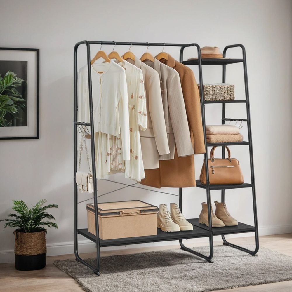 Of het nu in de slaapkamer, kleedkamer of hal is – dit kledingrek past zich aan jouw ruimte aan. Het vijflaagse rek kan zowel links als rechts worden gemonteerd, afhankelijk van jouw voorkeur en indeling.