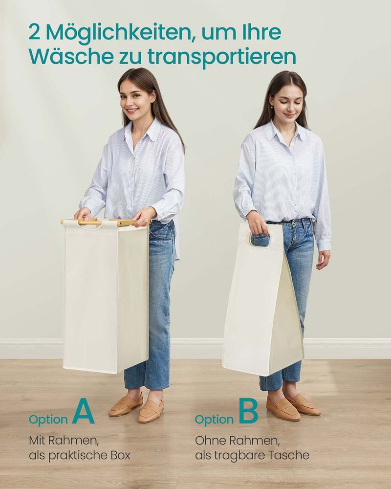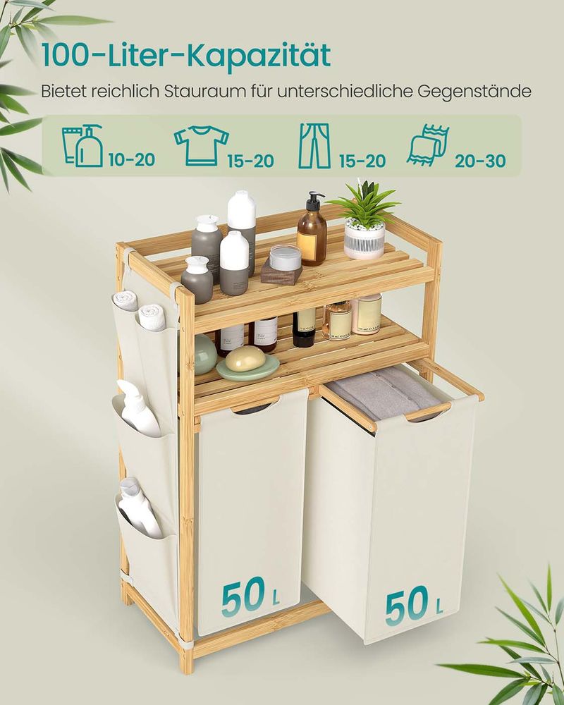 Dankzij de dubbele vakken kunt u uw wasgoed eenvoudig sorteren op kleur of type. Variant 1 biedt een totale capaciteit van 100 liter (50 liter per vak), Variant 2 biedt zelfs 150 liter (3 vakken van 50 liter).