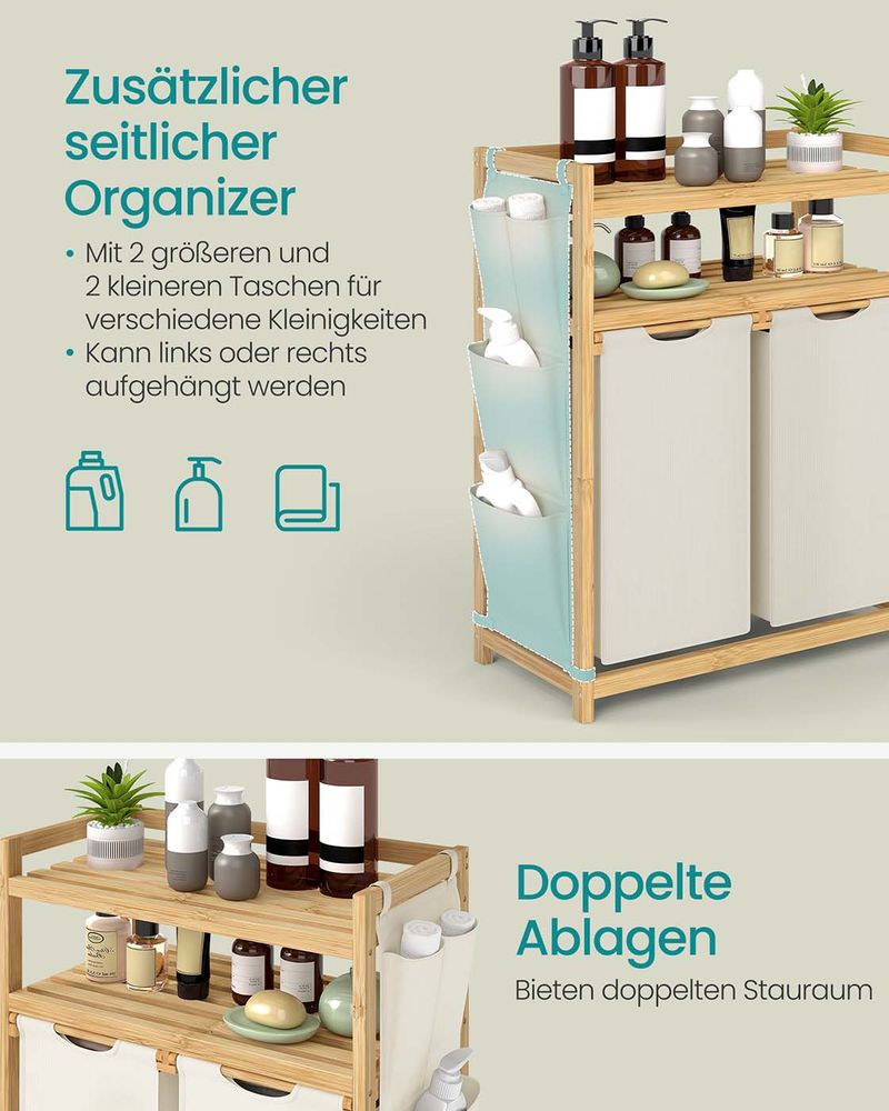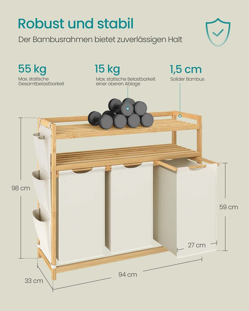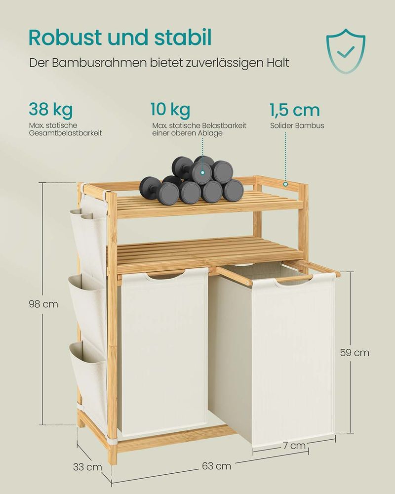Gemaakt van hoogwaardig bamboe, waardoor deze wasmand stabiel en robuust is. De planken zijn belastbaar tot 10 kg (Variant 1) of 15 kg (Variant 2). Opstaande randen voorkomen dat spullen eraf vallen.