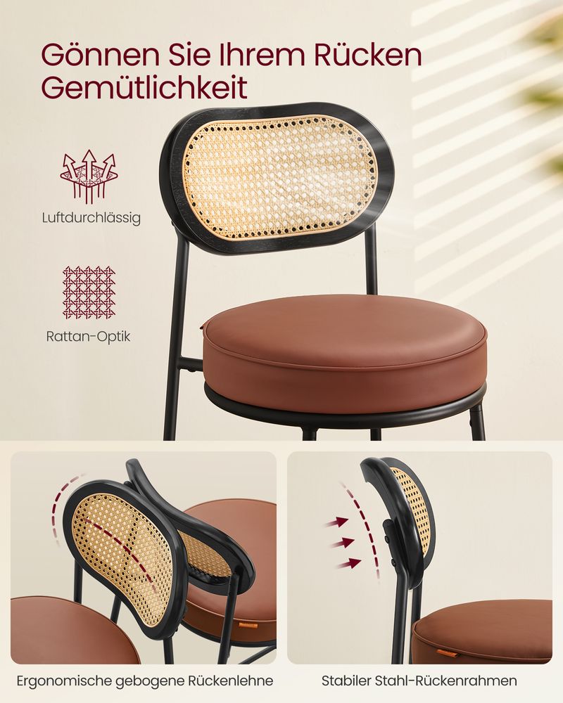 De gebogen rugleuning ondersteunt uw onderrug aan alle kanten en bevordert een ontspannen zithouding – ideaal voor lange ontbijtjes of gezellige avonden aan de bar.