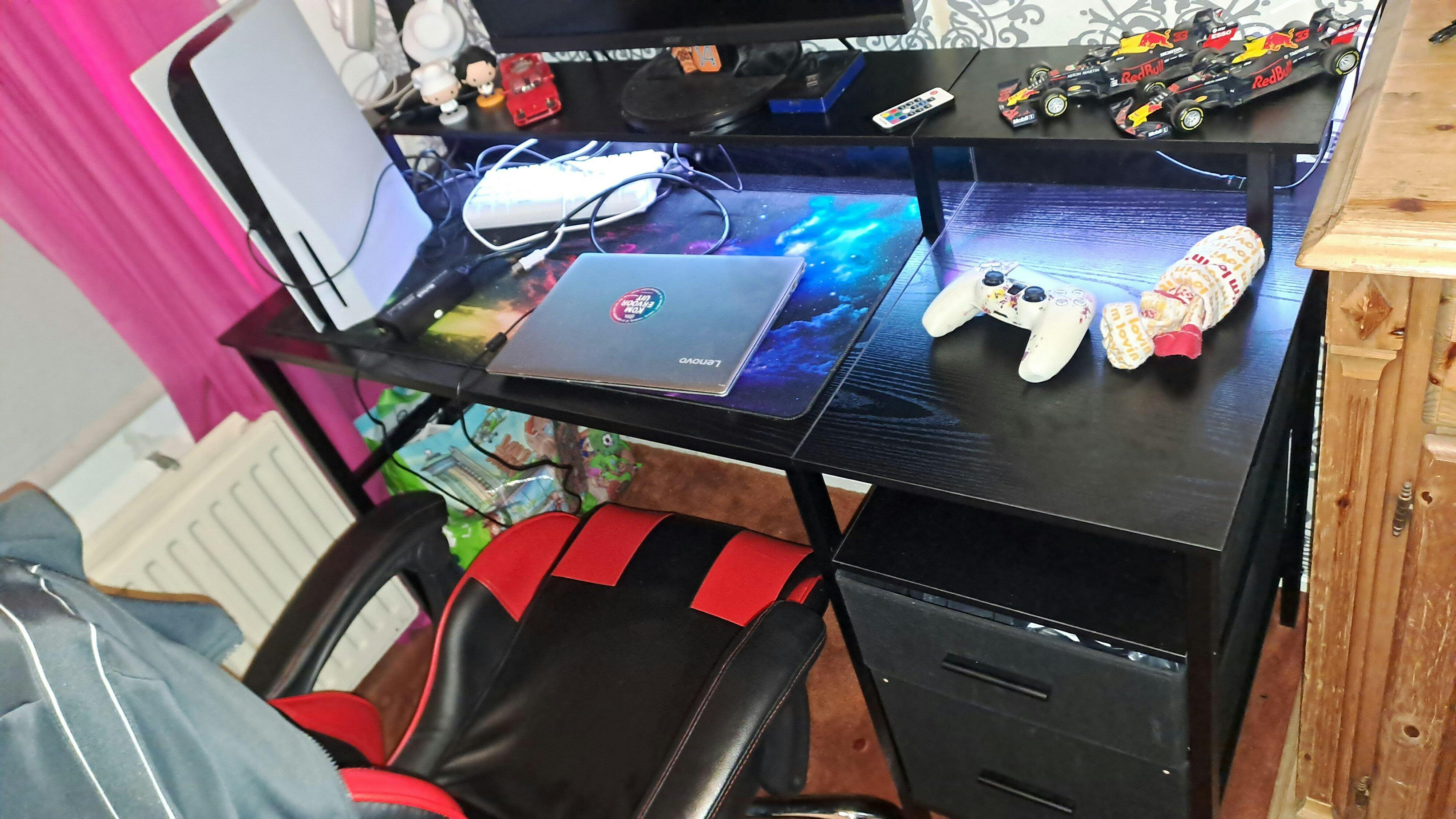 Dit bureau biedt voldoende opbergruimte: een open plank voor boeken, een bovenste lade met een hangmapfunctie voor ordners en een grote onderste lade voor kantoorbenodigdheden. Ideaal voor thuiswerken, gamen of studeren.