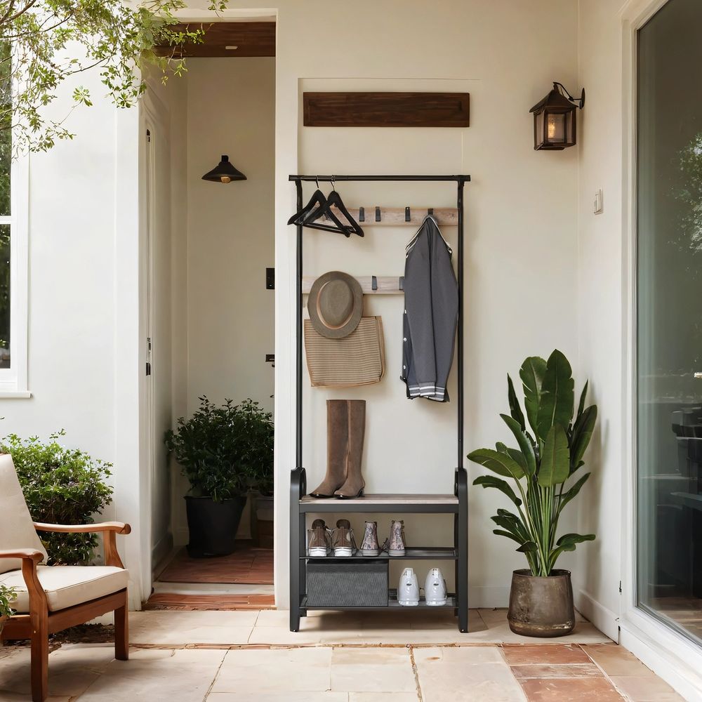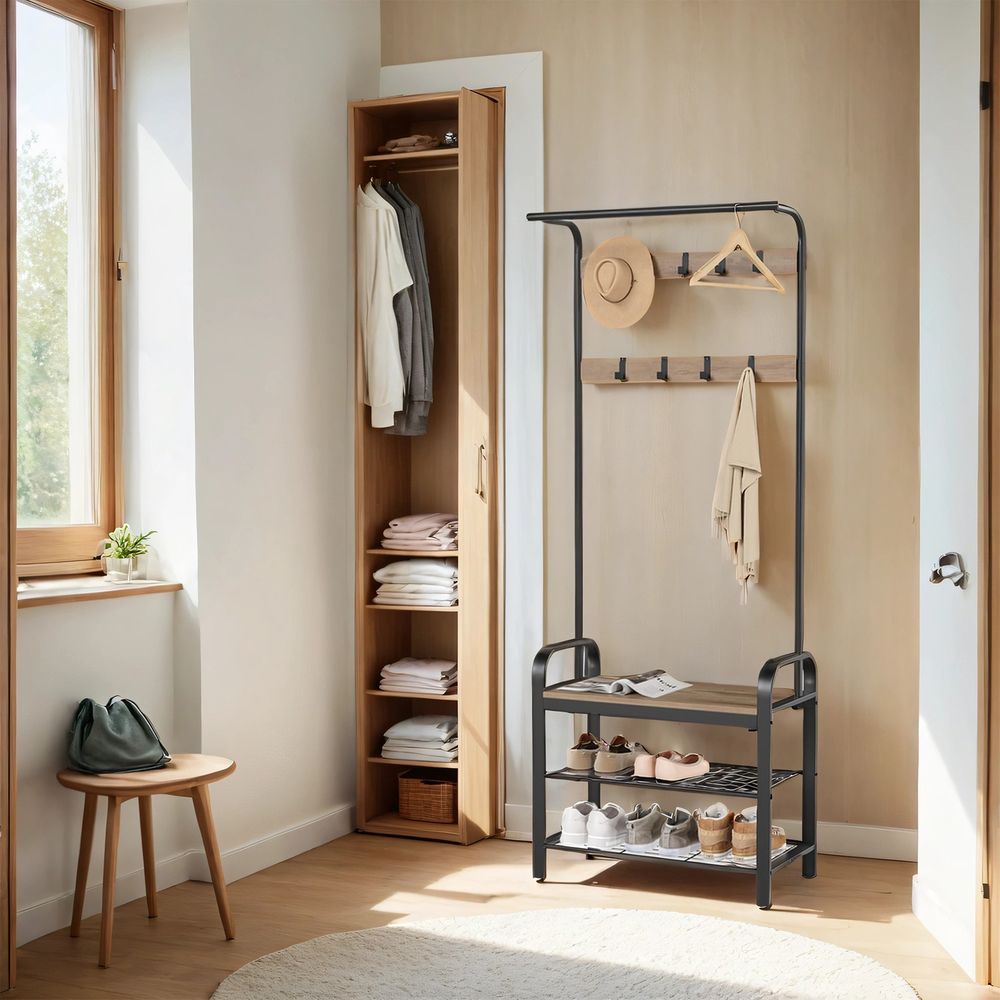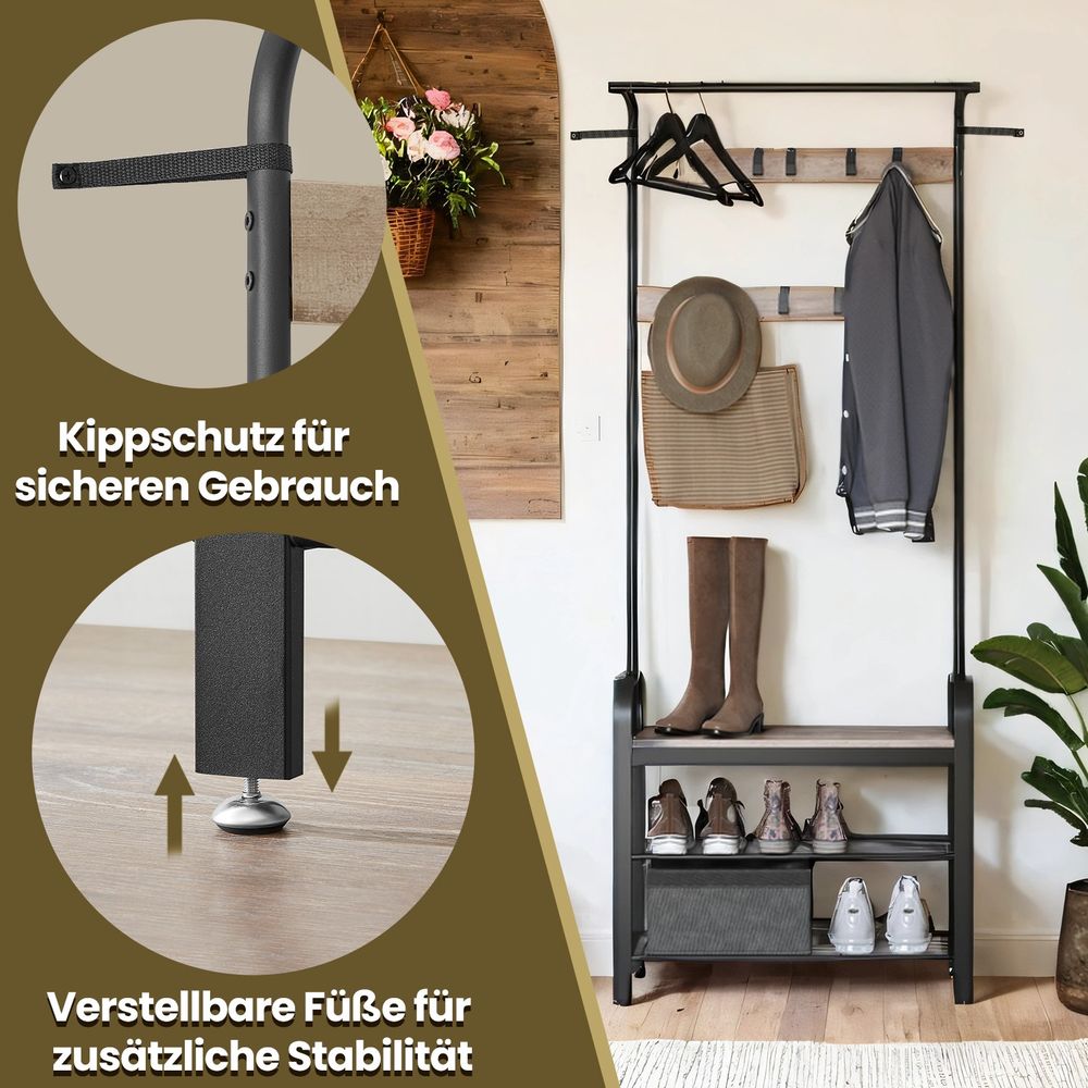 4-in-1 Garderoberek met Kapstok, Kledingstang, Zitbank en Schoenenrek – Industriële Stijl, Stevig Staal en Hout