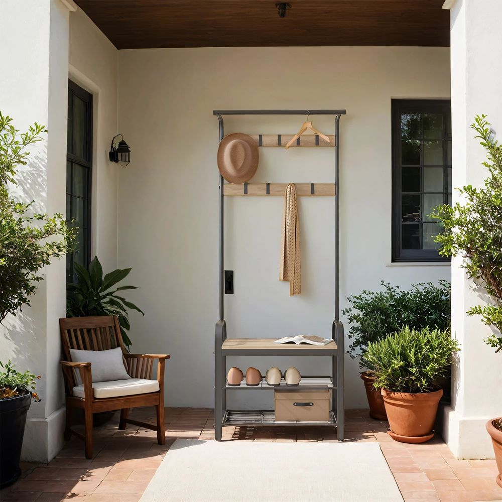 Het rek is vervaardigd uit sterk staal met dikke poten (3,8 cm breed) en hoogwaardige houtspanplaten, wat zorgt voor een solide constructie. De zitbank heeft een draagvermogen van 136 kg, zodat je er comfortabel op kunt zitten bij het wisselen van schoenen.