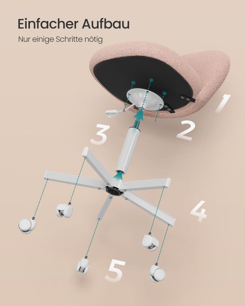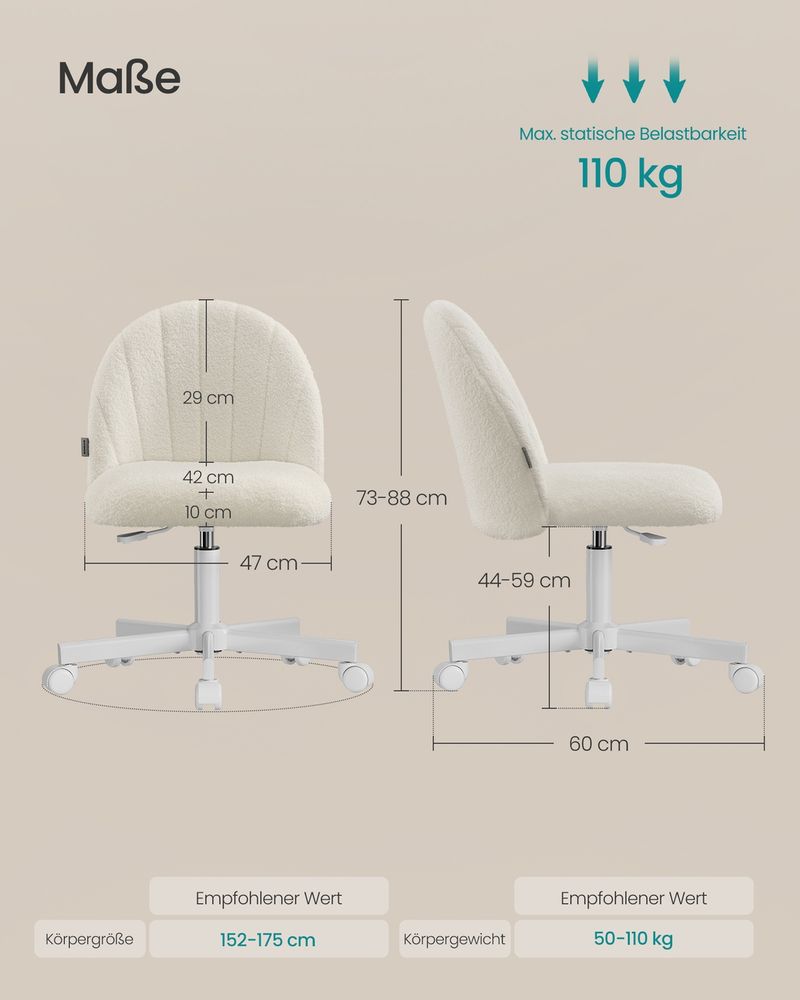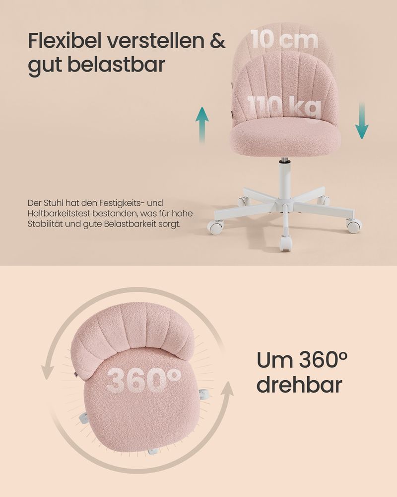 Dankzij het ruimtebesparende ontwerp past de stoel perfect in kleine ruimtes. De 360° draaibare wielen zorgen voor soepele bewegingen, terwijl de verstelbare zithoogte een ideale zithouding mogelijk maakt.