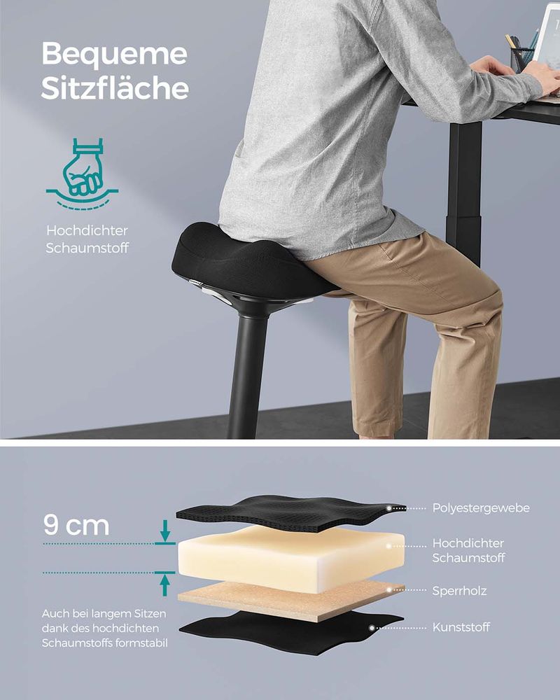 De ergonomische zadelzitting van De Vries Meubels is gevuld met 9 cm hoogwaardig schuim, wat langdurig comfort biedt, zelfs tijdens lange werkdagen. De vorm ondersteunt een natuurlijke zithouding en helpt uw rug te ontlasten, ideaal voor wie veel zit of staand werkt.