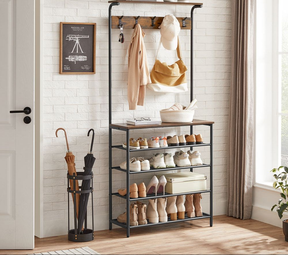 Met 5 legplanken aan de onderkant voor schoenen en tassen, 5 dubbele haken voor jassen en tassen, en een extra bovenrek voor decoratie of accessoires, brengt dit garderoberek orde in elke ruimte.