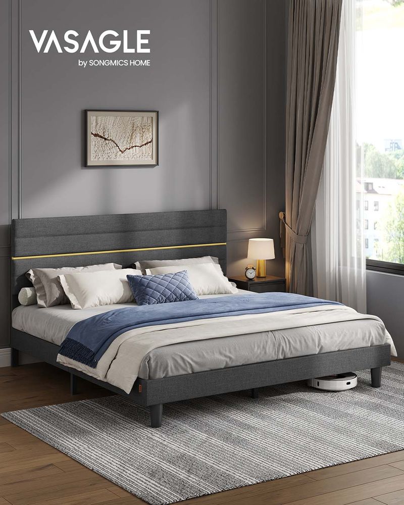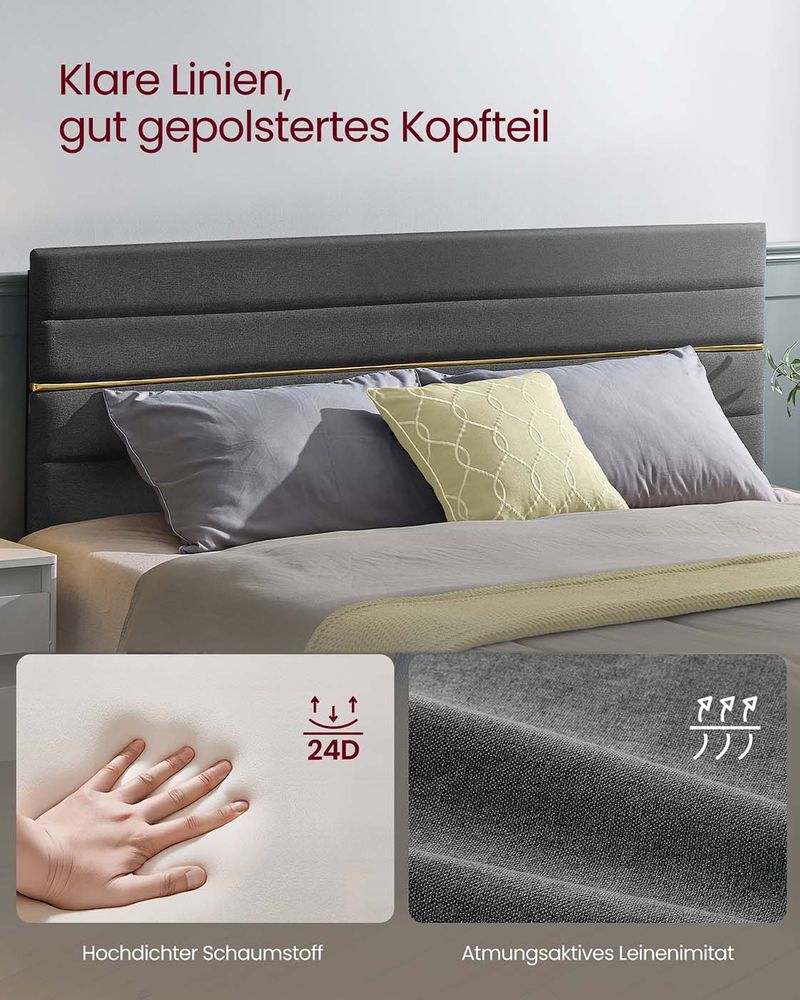 Het ademende imitatielinnen en het schuim met hoge dichtheid zorgen voor een zachte, comfortabele rugleuning. Het strakke ontwerp met goudkleurige sierlijn op het hoofdbord geeft het bed een elegante uitstraling.