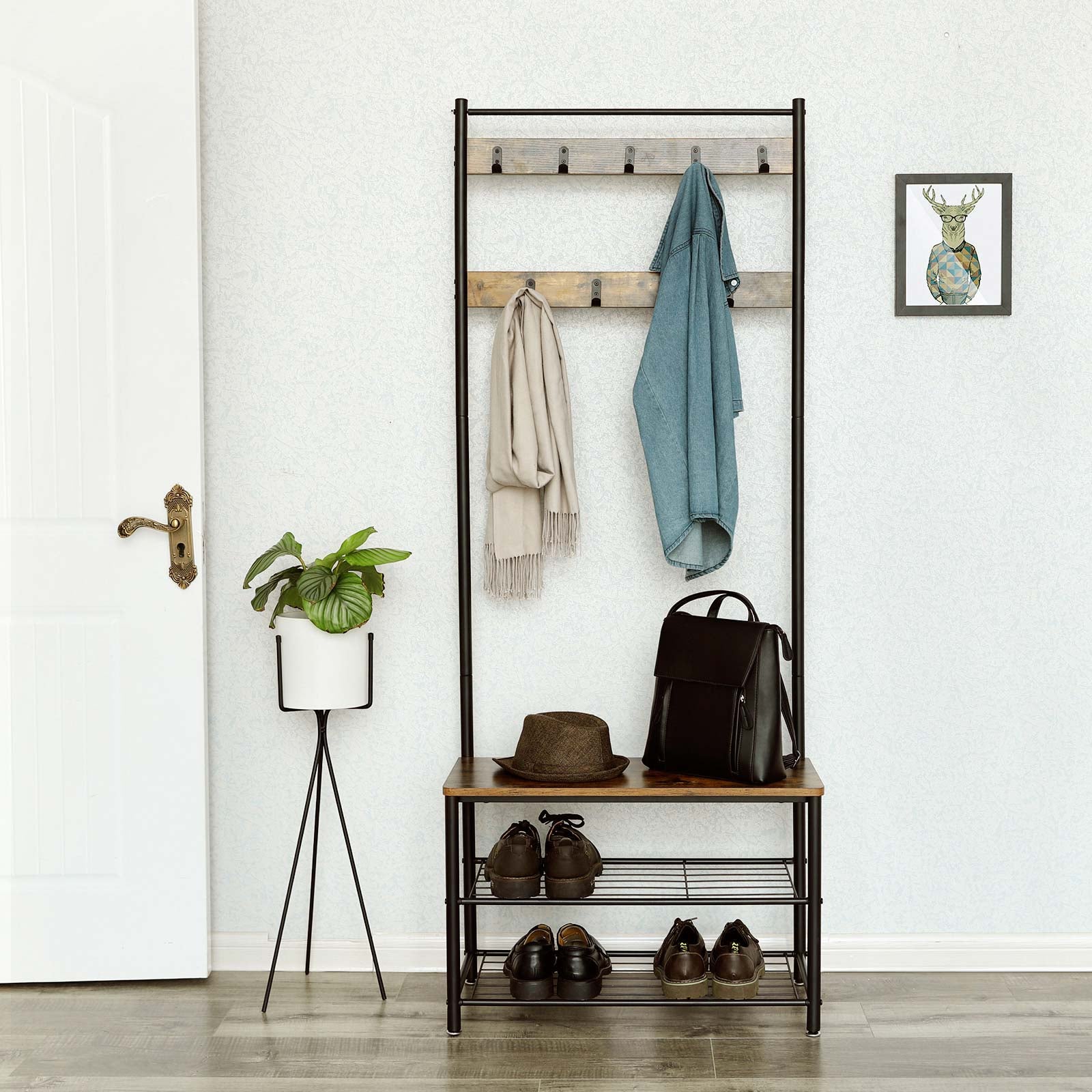 Deze multifunctionele kapstok combineert kledinghaken, een schoenenbank en een schoenenrek in één. Hang je jassen en tassen op, berg schoenen netjes op en neem comfortabel plaats bij het aan- of uittrekken van schoenen.