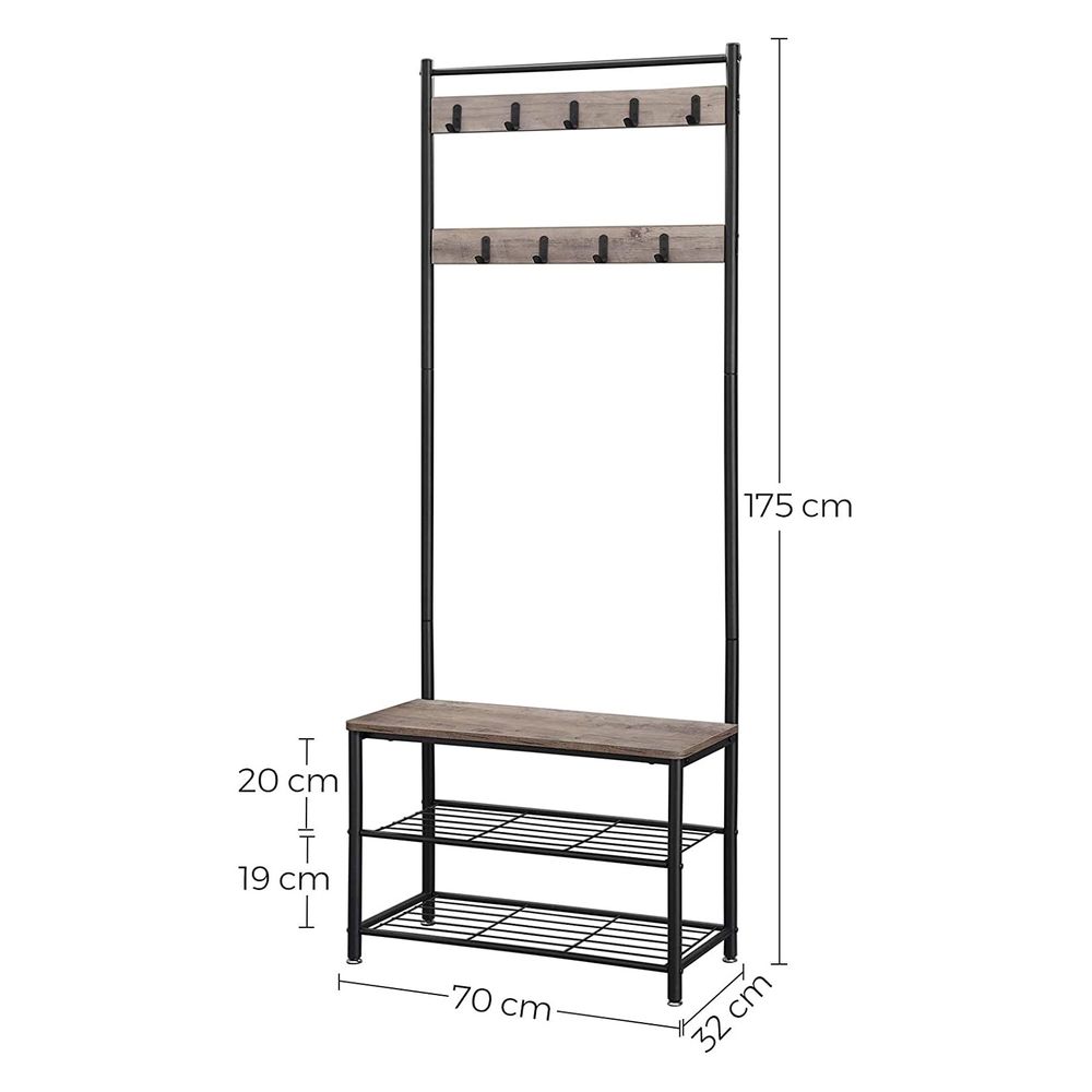 Hang je jas, sjaal of hoed aan de 9 haken en plaats je schoenen overzichtelijk op de 2 metalen roosters. Daarna neem je comfortabel plaats op het stevige bankje om je schoenen uit of aan te trekken.