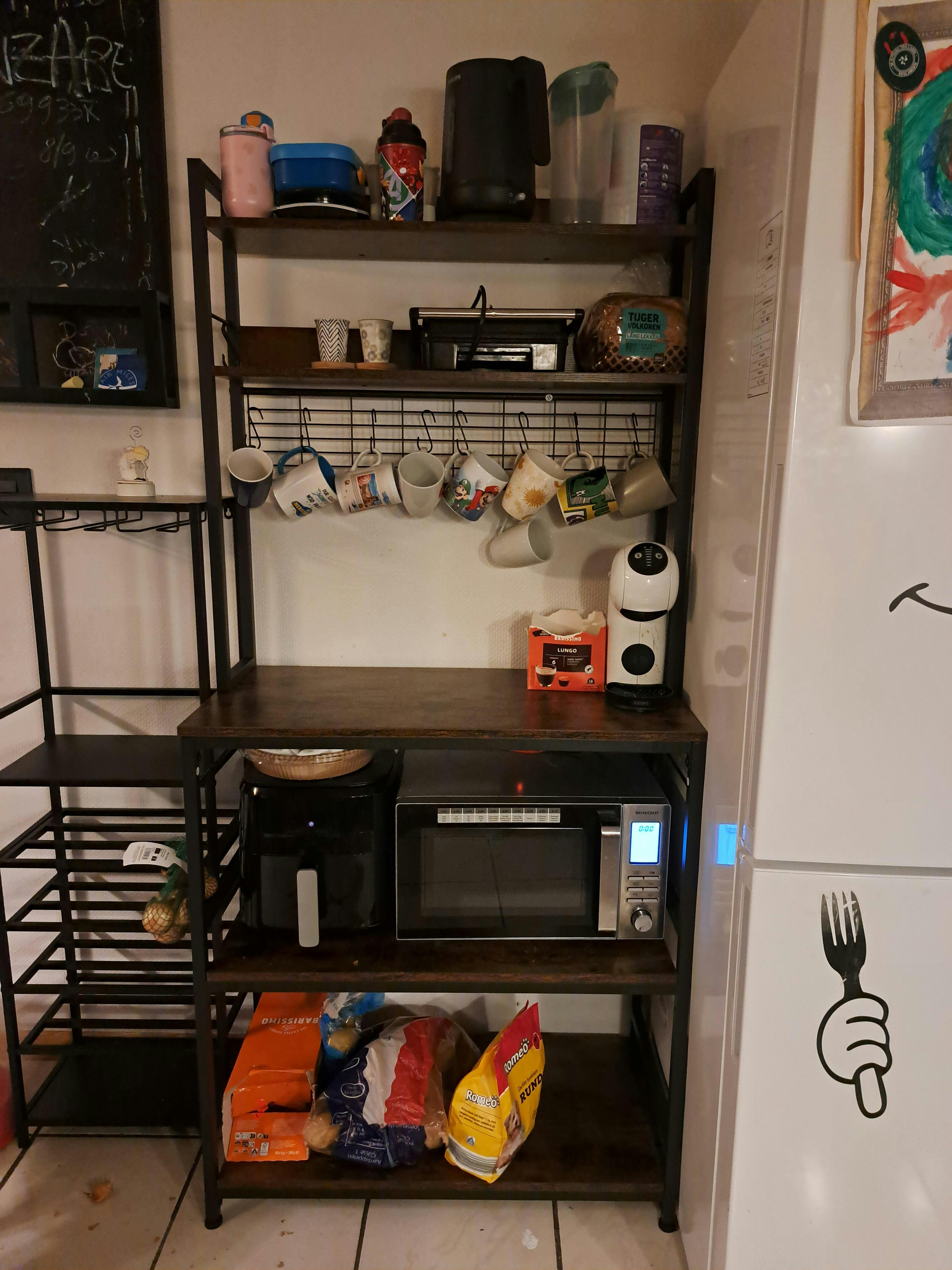 De middelste plank is in hoogte verstelbaar (4,1 cm), zodat je gemakkelijk kleine of grotere apparaten kwijt kunt. Met 5 stevige planken en 14 S-haken biedt het rek volop ruimte voor pannen, bekers en keukengerei.