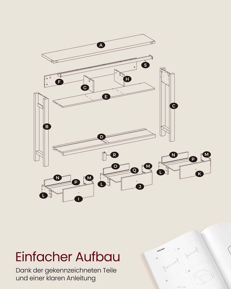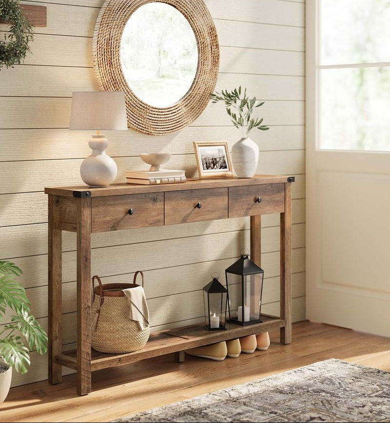De ruime tafelblad biedt plek voor decoratie, sleutels of dagelijkse benodigdheden. Drie lades verbergen kleinere spullen uit het zicht, terwijl de onderste open plank ideaal is voor manden, dozen of schoenen.