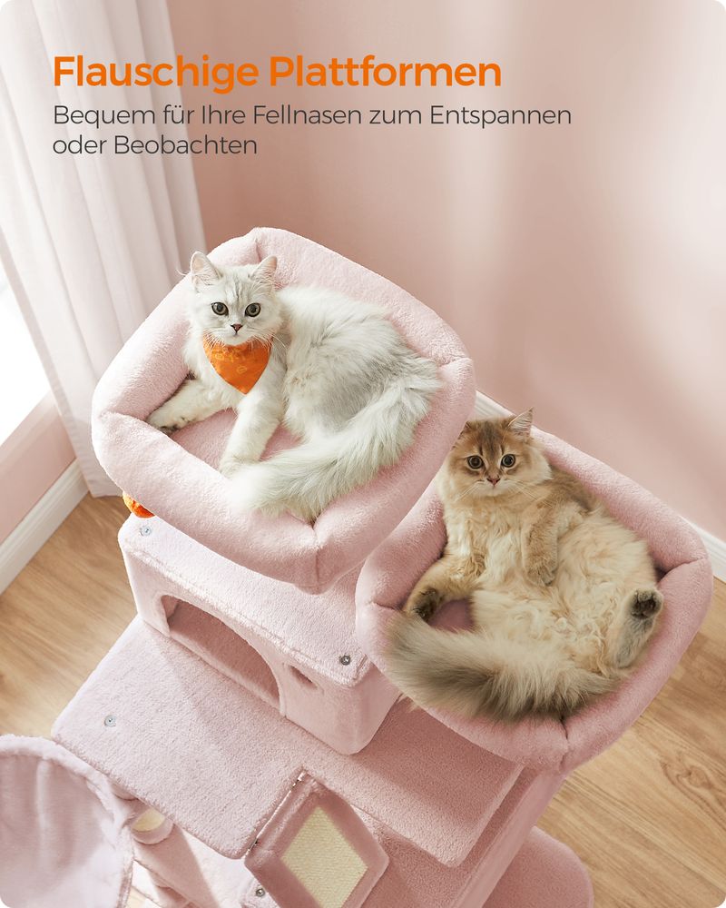 Twee zachte platforms, twee comfortabele kattenholletjes, een hangmand, twee pluche speelballen en een hangmat zorgen voor voldoende variatie en ontspanning. Perfect geschikt voor huishoudens met meerdere katten die graag klimmen, rusten en spelen.