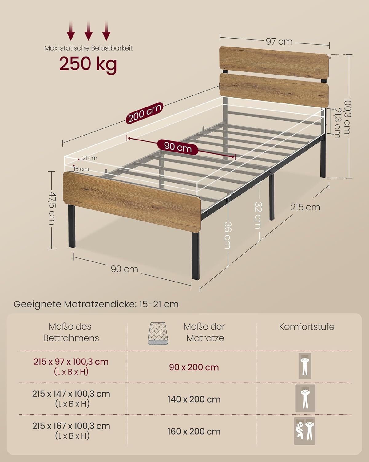 De stevige staalconstructie met robuuste poten kan tot 500 kg dragen. Rubberen voetdoppen, zijsteunen en kunststof verbindingen verminderen geluid en garanderen een rustige nachtrust.