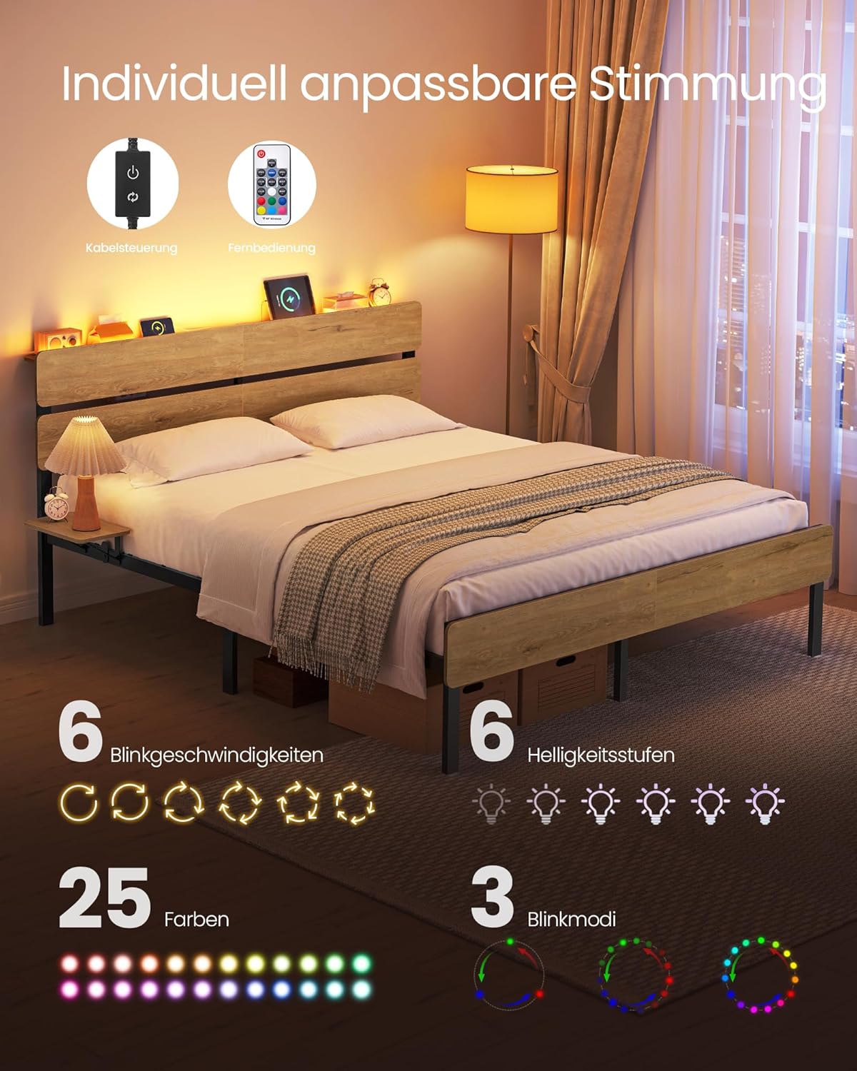 Metalen Bedframe Met LED-Verlichting En Oplaadstation – Industrieel Design – USB-A En USB-C – Met Opbergruimte Onder Het Bed