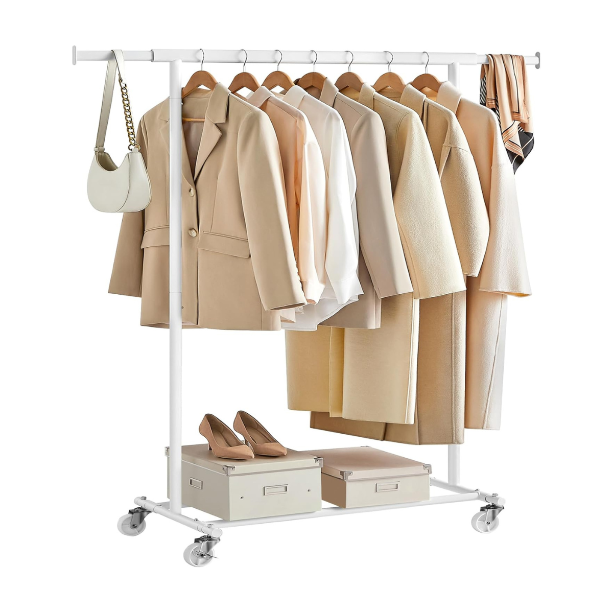 De uitschuifbare stang (92–132 cm) biedt volop ruimte voor jassen, tassen en hoeden. Op het onderste rek kunt u dozen of opbergmanden kwijt – ideaal om alles netjes te organiseren.