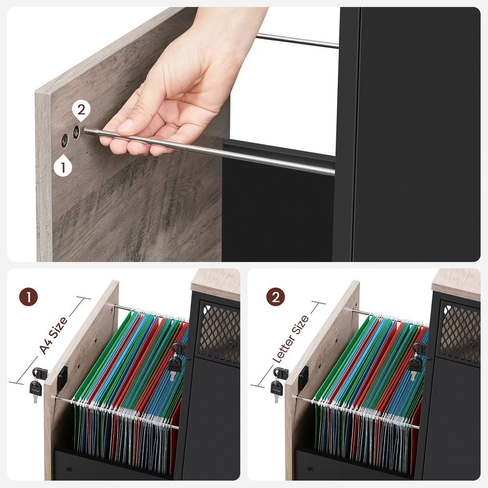 De geperforeerde zijpanelen geven het meubel een stoere uitstraling en beschermen tegelijk tegen vallende items. In de afsluitbare laden blijven uw documenten veilig, terwijl de extra steunrol voorkomt dat de lade kantelt.