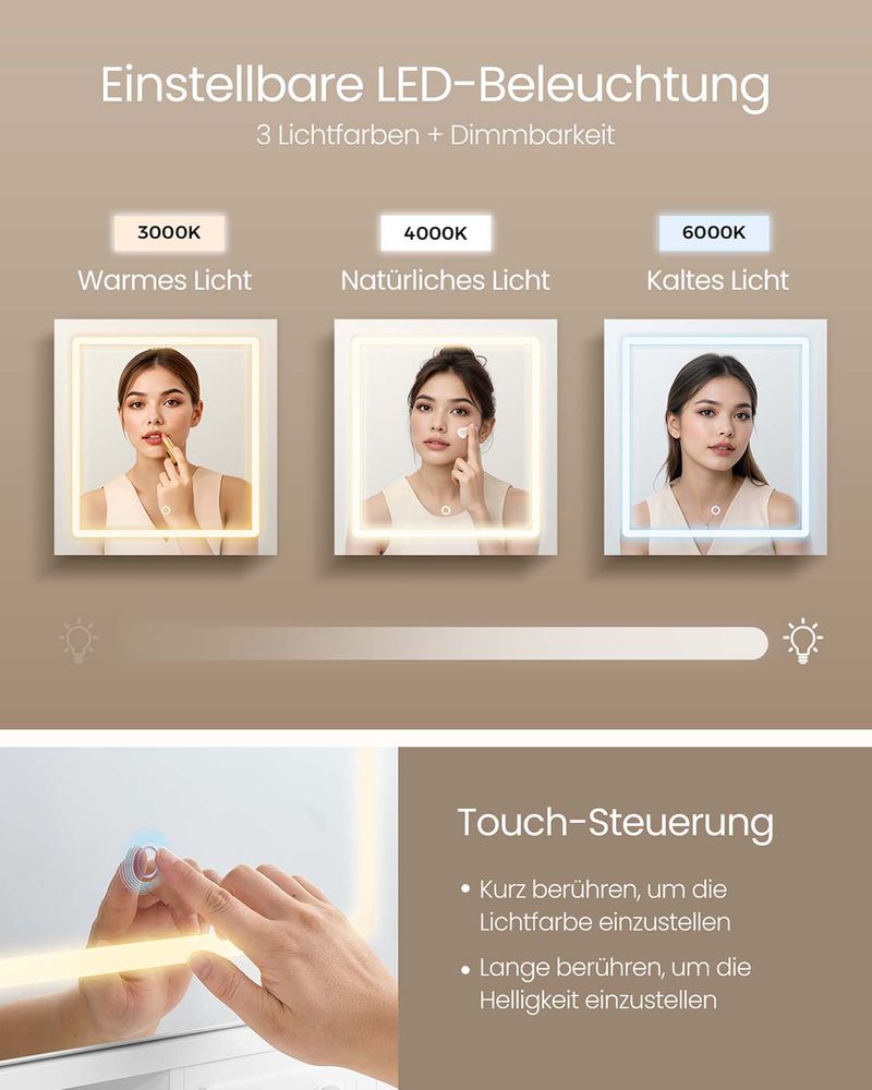 De grote spiegel met geïntegreerde LED-verlichting heeft drie instelbare lichtkleuren – koud, natuurlijk en warm licht – en een traploos dimbare helderheid via de handige touchbediening. De spiegel is flexibel zijwaarts verschuifbaar, zodat je hem altijd in de perfecte positie kunt plaatsen.