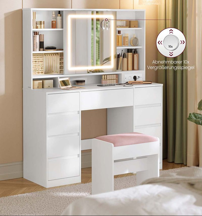 Moderne Kaptafel met LED-Spiegel - 9 Lades – 110 cm Breed – Wit – Inclusief 10x Vergrotende Spiegel