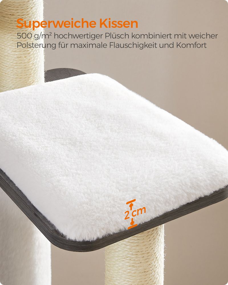 De drie 2 cm dikke kussens zijn rijk gevuld en bekleed met extra dicht 500 g/m² pluche – zachter en voller dan standaardstoffen. Dat zorgt voor een heerlijk warme en comfortabele rustplek voor jouw katten.