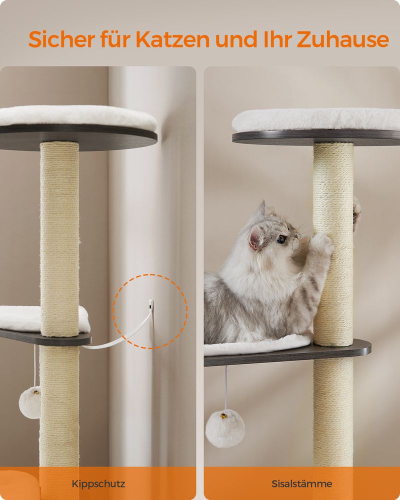Dankzij de sterke spaanplaatconstructie, dikke basis met antislippads en een meegeleverde kantelbeveiliging biedt deze krabpaal maximale veiligheid, ook voor grotere katten.