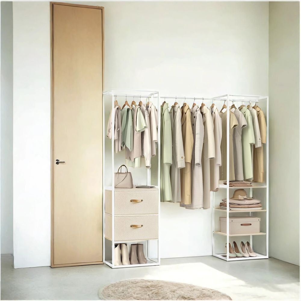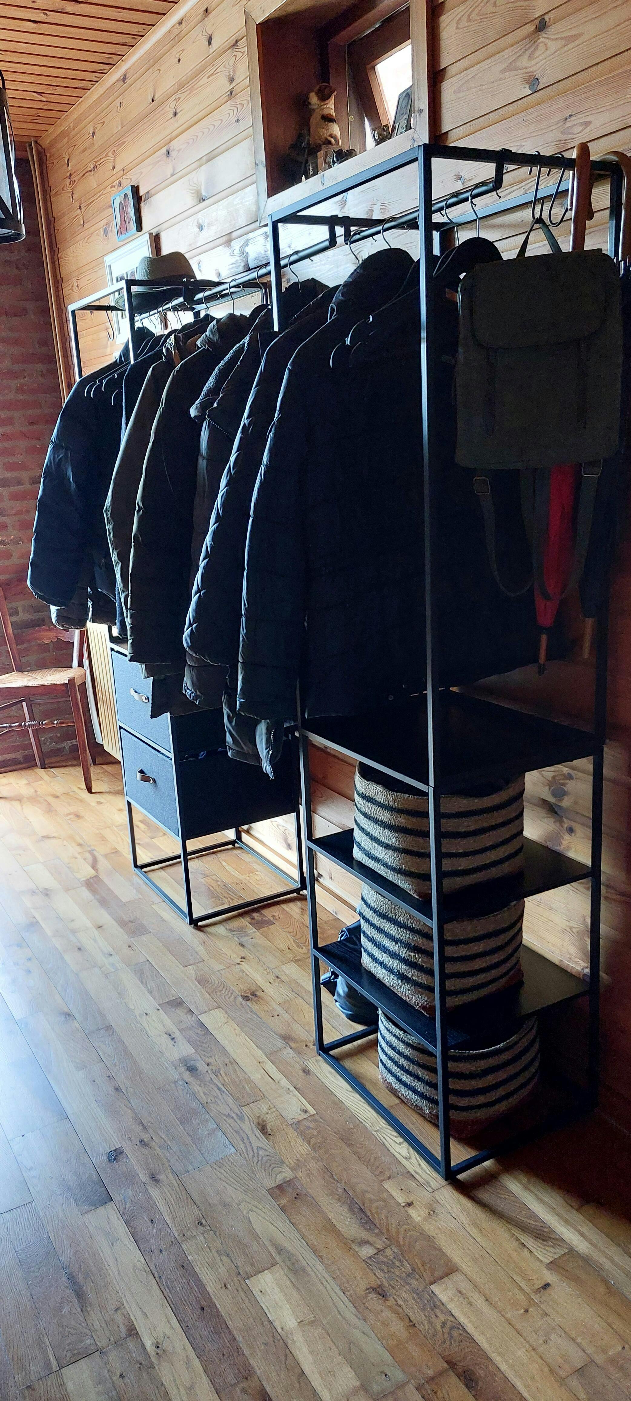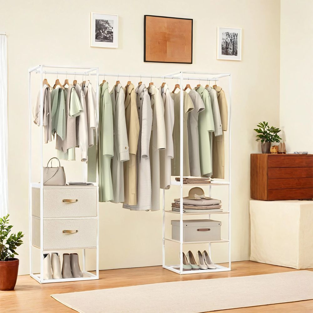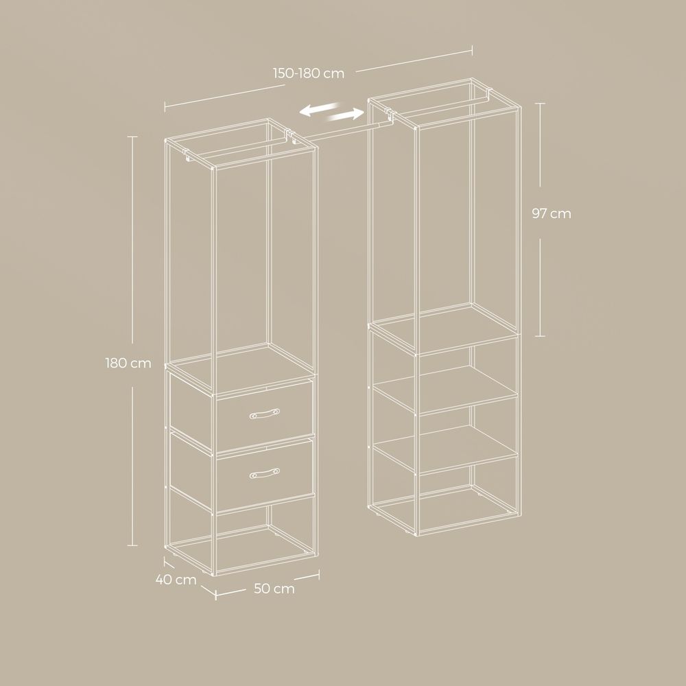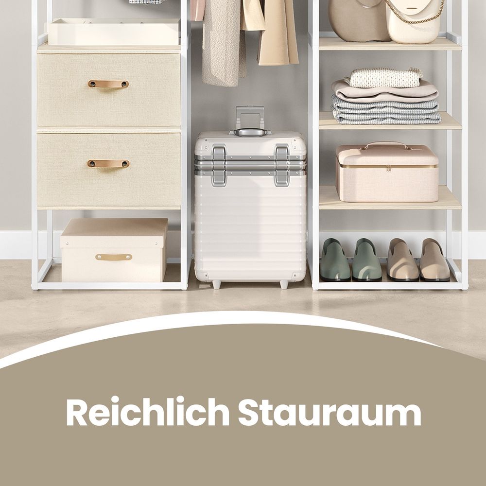 De kast beschikt over 2 vaste kledingstangen, 1 uittrekbare stang, 2 stoffen lades en 4 stevige planken. Zo berg je moeiteloos shirts, jassen, broeken, schoenen, tassen en accessoires overzichtelijk op. Dankzij het open ontwerp houd je alles in één oogopslag zichtbaar – stijlvol én praktisch.