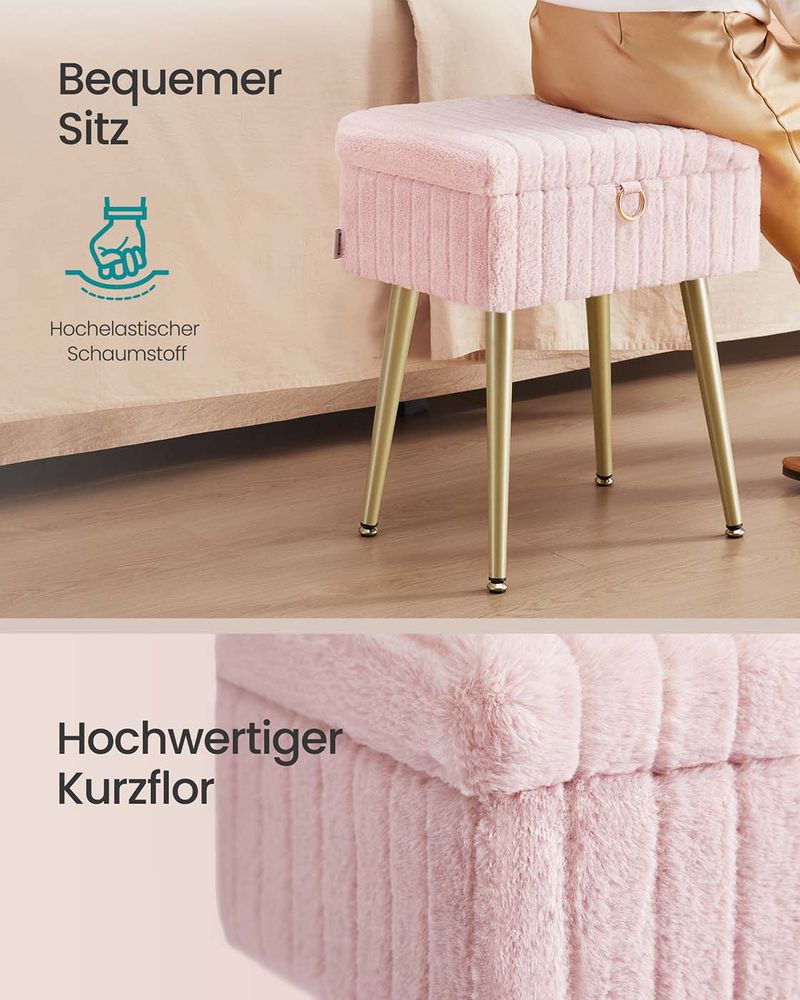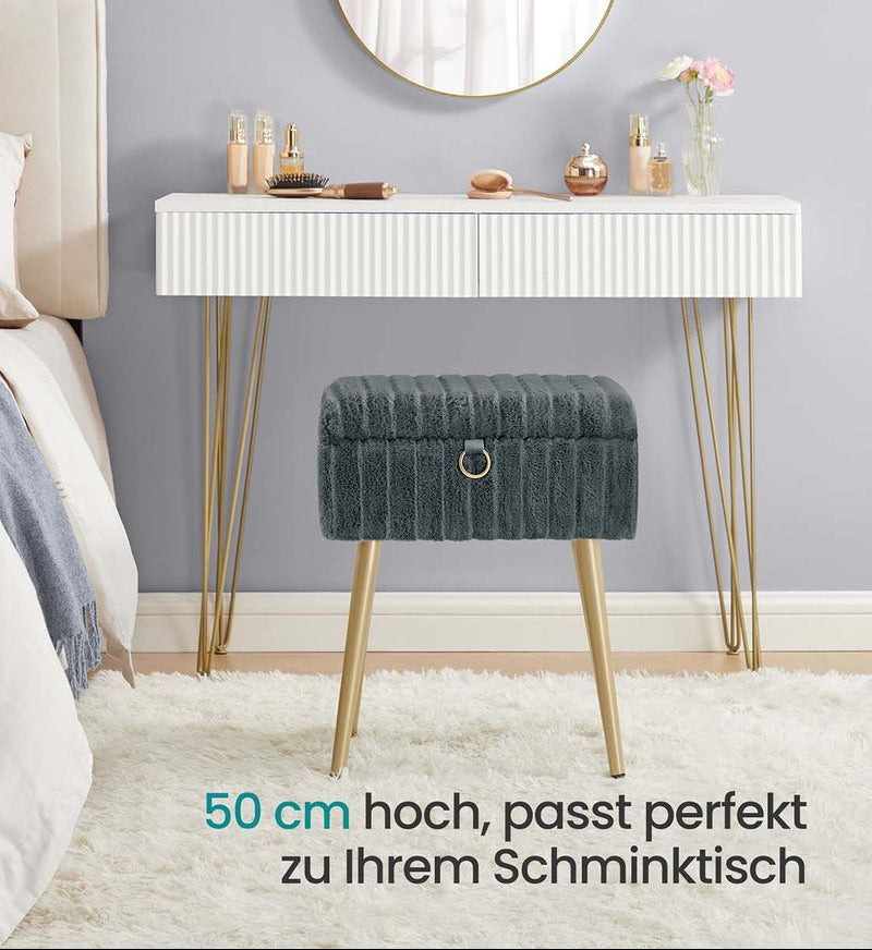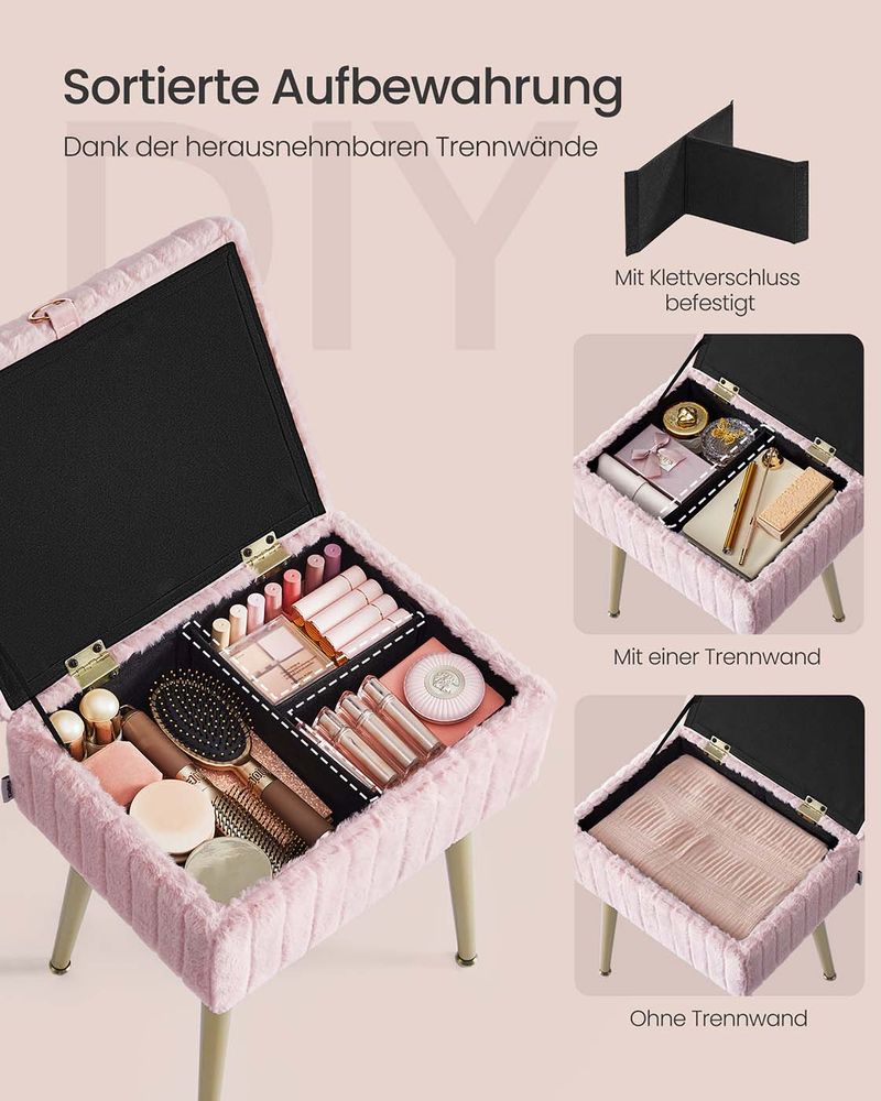De hocker biedt discrete ruimte voor make-up, accessoires of persoonlijke spullen – perfect om uw kamer netjes te houden.