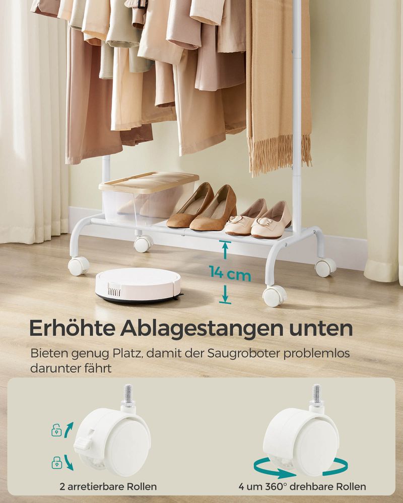 Onder de kledingroede bevinden zich twee stevige leggers op 14 cm hoogte – ideaal om schoenen of opbergboxen op te plaatsen. De verhoogde positie maakt het ook mogelijk voor een robotstofzuiger om er probleemloos onderdoor te rijden.