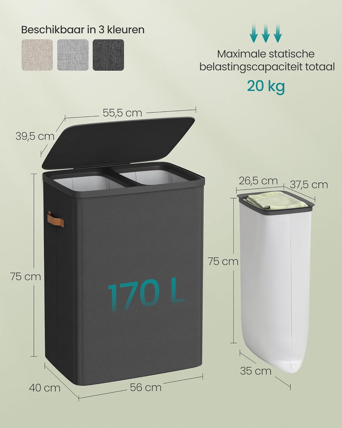 Met afmetingen van 56 x 40 x 75 cm en een inhoud van 170 liter biedt deze wasmand voldoende ruimte voor een week wasgoed van een gezin van 3 personen. De handgrepen op de mand en de aparte binnenzakken maken vervoer naar de wasmachine eenvoudig en comfortabel.