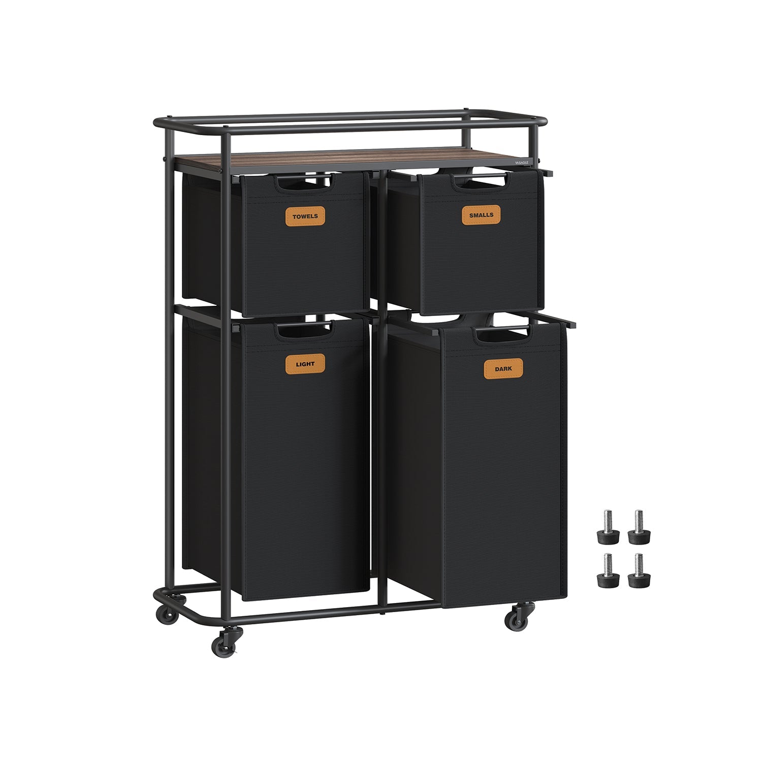 Wassorteerder met 4 Mandjes en Wielen – Waswagen met Labels en Bovenplank – 150 Liter – 72 cm Breed – Tot 39 kg Draagvermogen