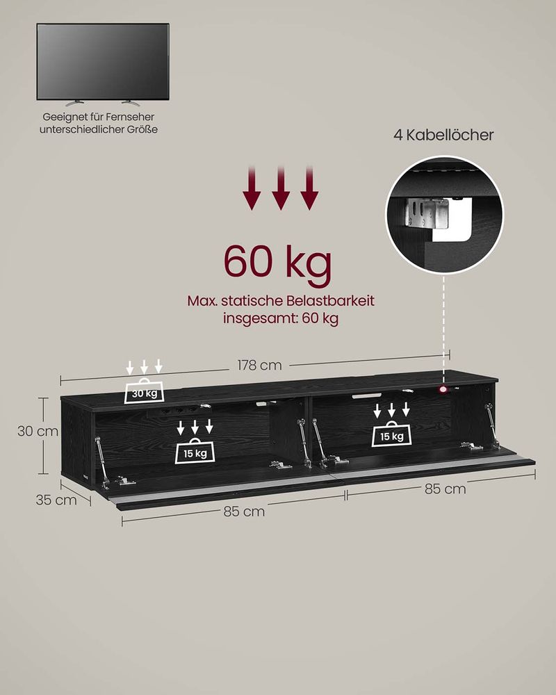 Het meubel is 147 of 178 cm breed en biedt dankzij de verstevigingsbalk onder het bovenblad een draagvermogen tot 30 kg. Geschikt voor flatscreens in verschillende formaten, van klein tot groot.