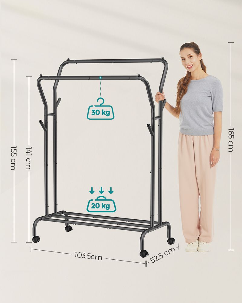 Kledingrek op Wielen – Dubbele Stang met Haken en Opbergrek – Mobiele Kledingstandaard tot 100 kg – Verstelbaar en Stabiel