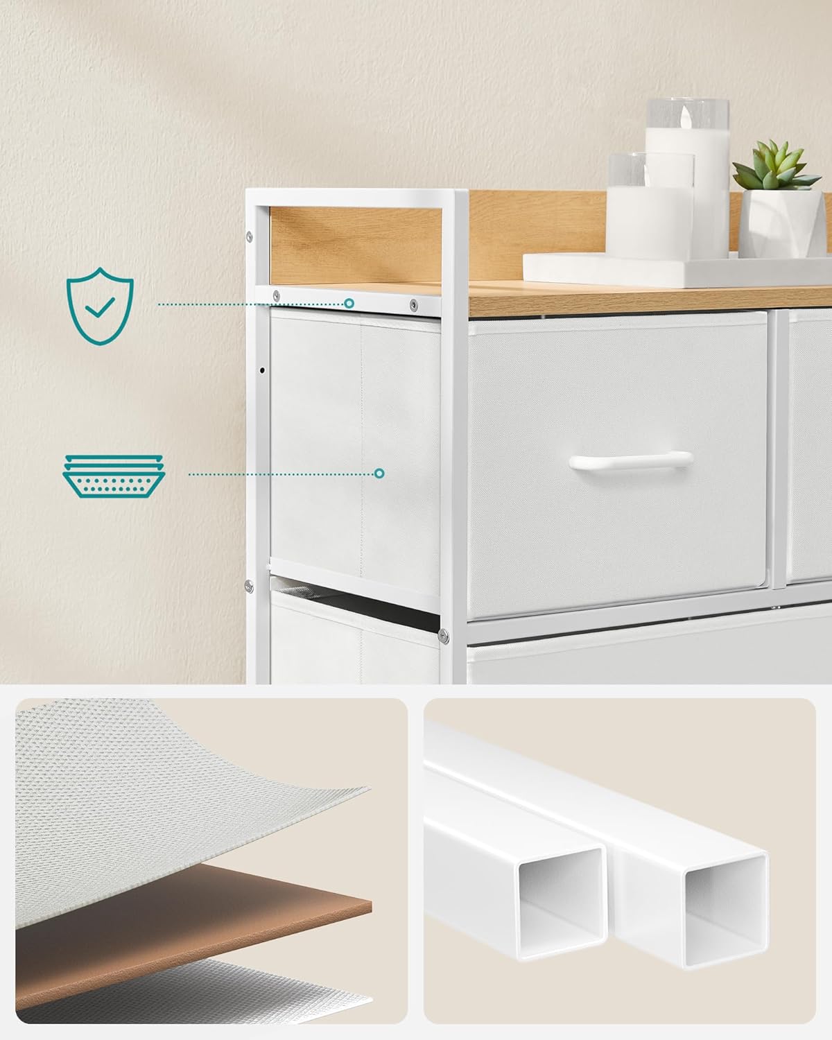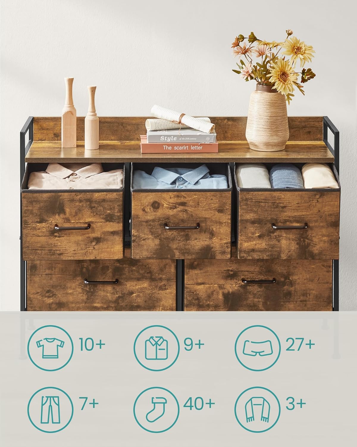 Ladekast met 5 Stoffen Lades – Kast voor Slaapkamer of Woonkamer – Met Zijlatten en Opstaande Rand – 98 cm Breed