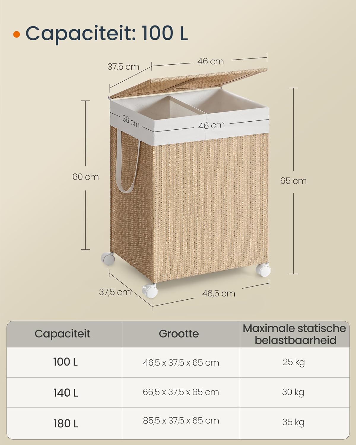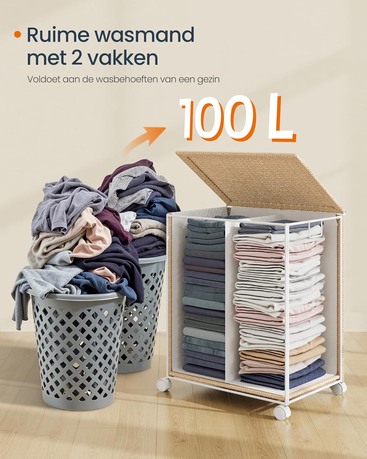 Wasmand met 2 Compartimenten – 100 L – Met Wielen, Deksel en Uitneembare Waszak – Rotan Look – Natuurlijk Beige