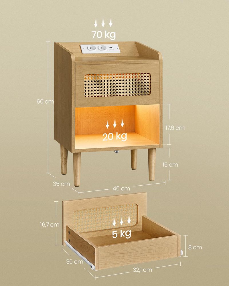 BOHO Nachtkastje met Lade en Open Vak – Massief Houten Poten – Ingebouwd Laadstation & Bewegingssensor Verlichting