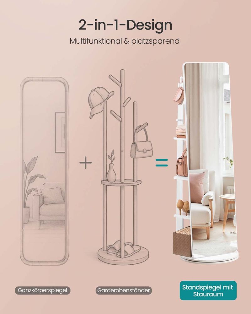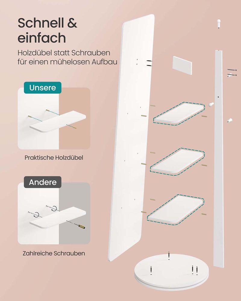 Staande Spiegel Met Opbergruimte – 360° Draaibaar – Met 4 Planken En 4 Haken – Full-Body Spiegel – MDF En Veiligheidsglas