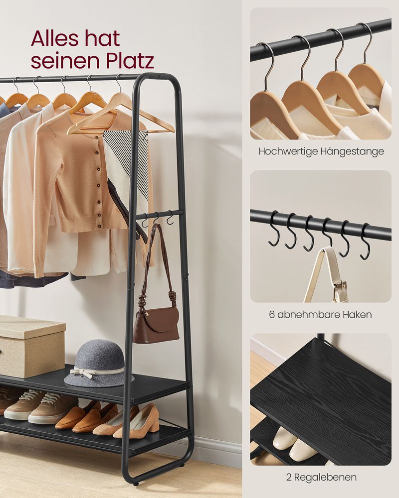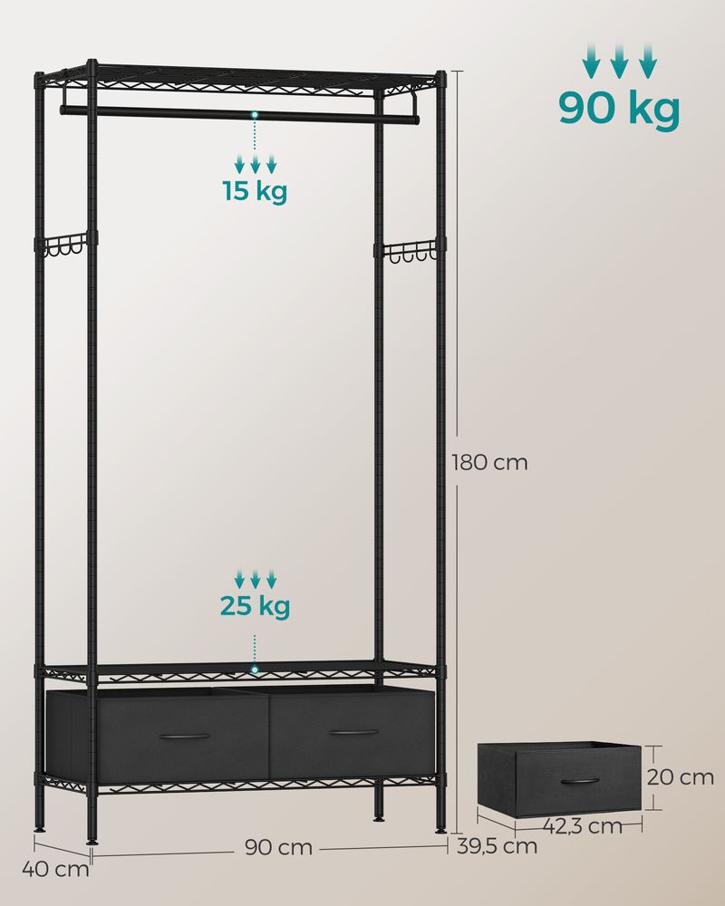 Kledingrek Zwart Metaal – Compact Garderoberek met Lades en Haken – Verstelbare Roede en Planken – 90 cm Breed – Tot 90 kg Draagvermogen