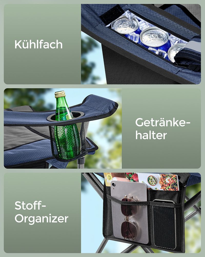 De geïntegreerde bekerhouder in de armleuning houdt je favoriete drankje altijd binnen handbereik. Dankzij het opvouwbare ontwerp neem je de stoel eenvoudig mee in de auto of camper.