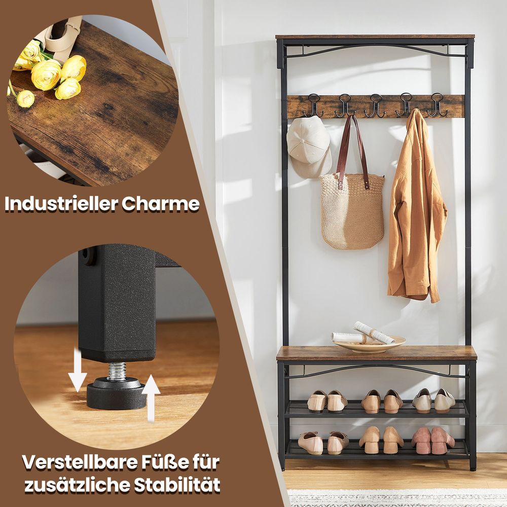 4-in-1 Garderoberek met Kapstok, Kledingstang, Zitbank en Schoenenrek – Industriële Stijl, Stevig Staal en Hout