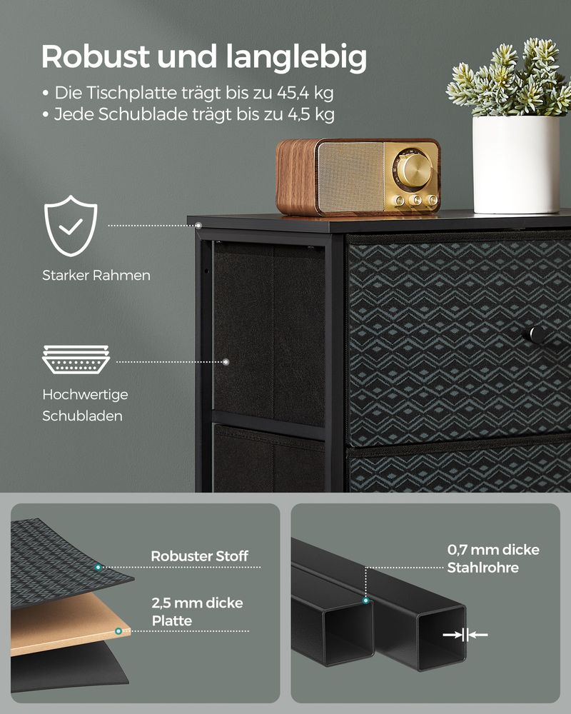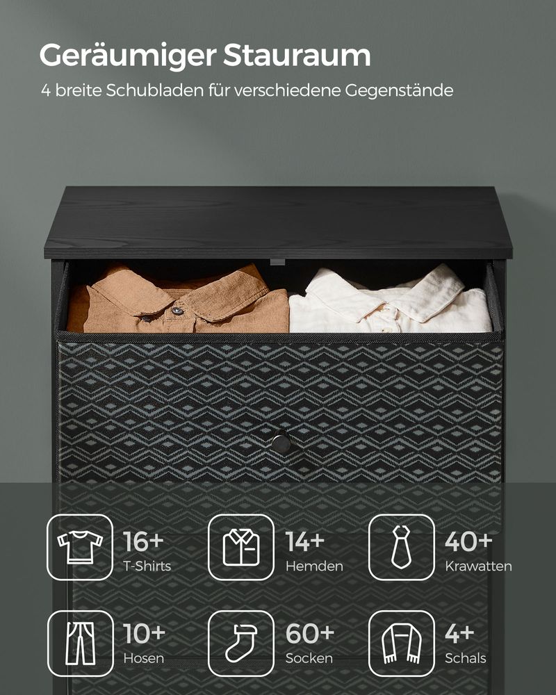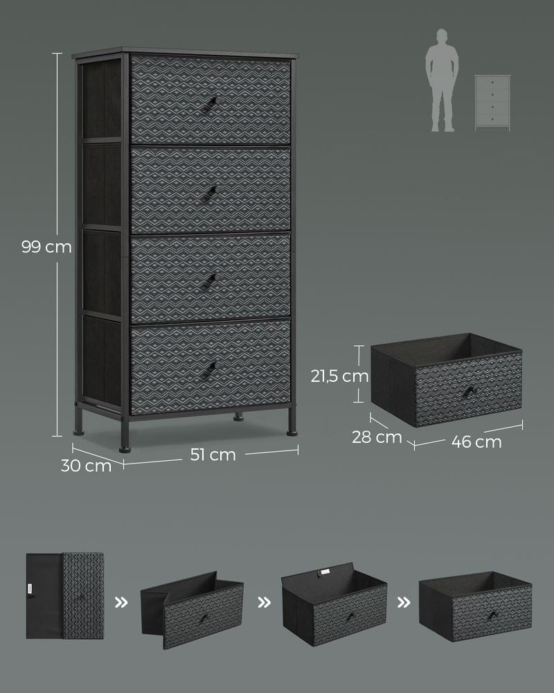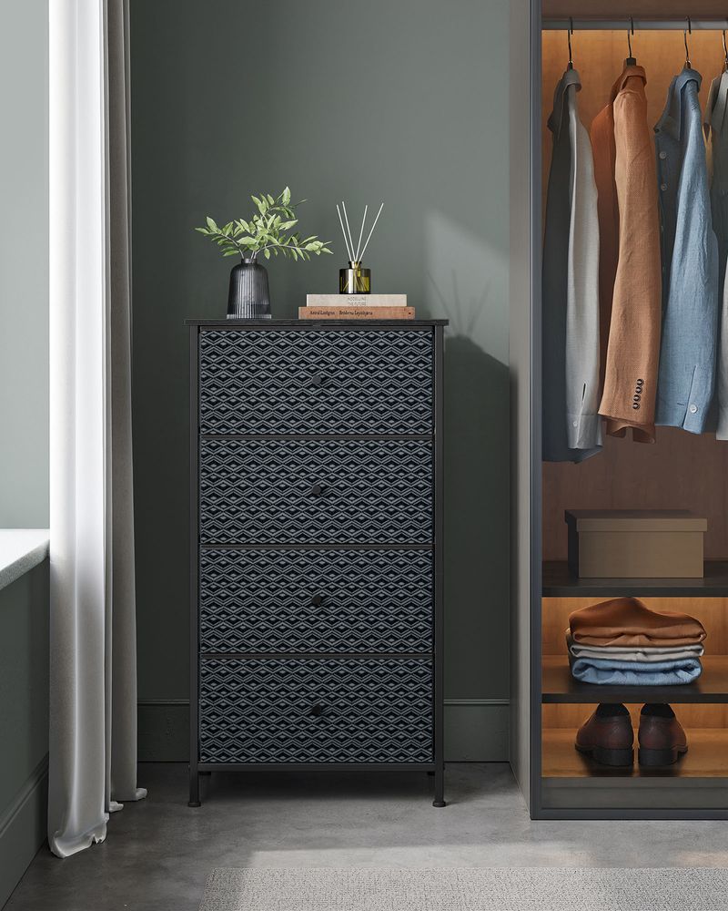 Ladekast Zwart-Wit – Opbergkast met 5 Stoffen Lades – Geometrisch Design – Metalen Frame – 99 cm Hoog – Tot 63,5 kg Draagvermogen