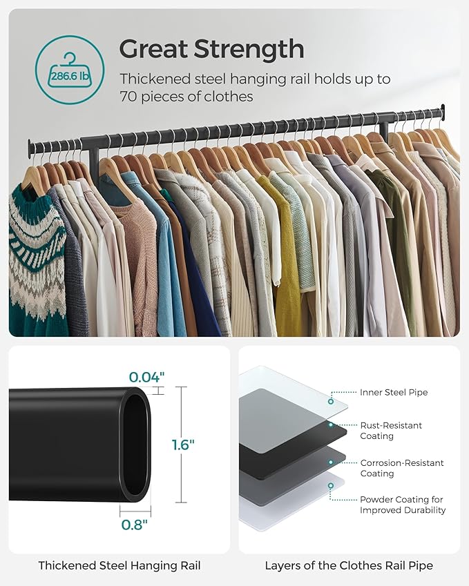 De bovenste stang is uitschuifbaar van 110 tot 150 cm. Aan beide uiteinden kun je bovendien accessoires zoals hoeden, sjaals of handtassen ophangen—voor een optimale benutting van de ruimte.