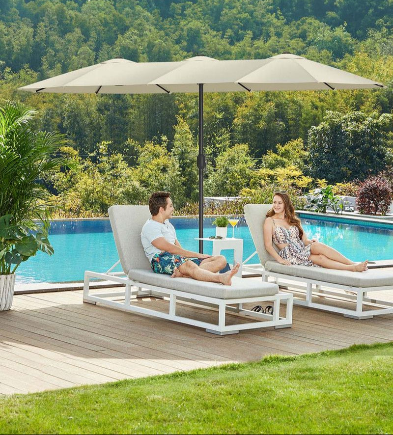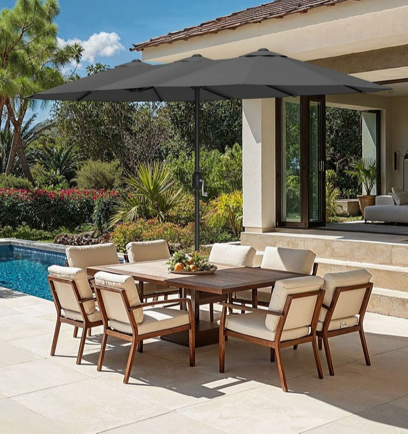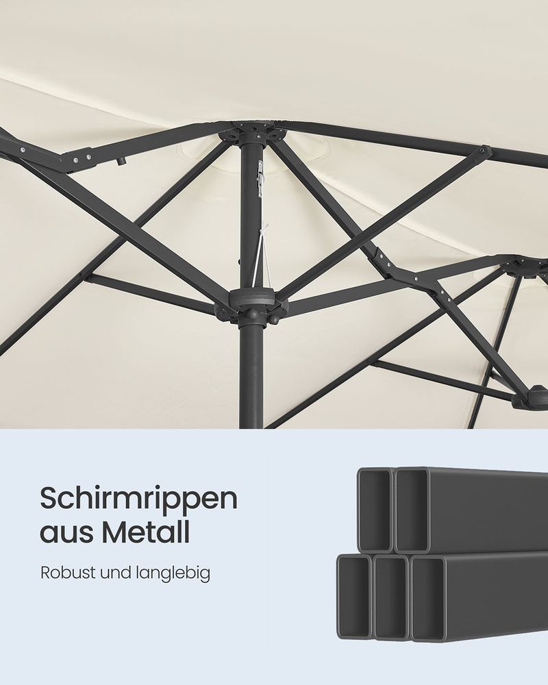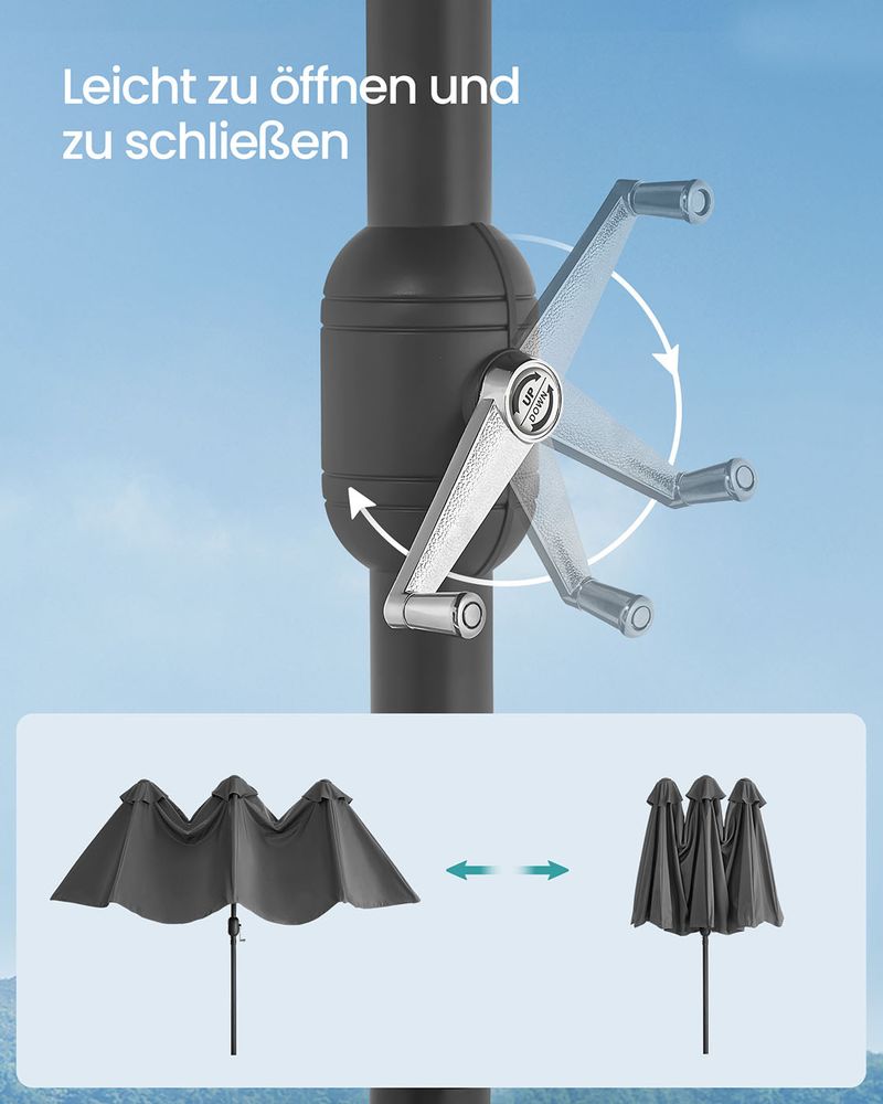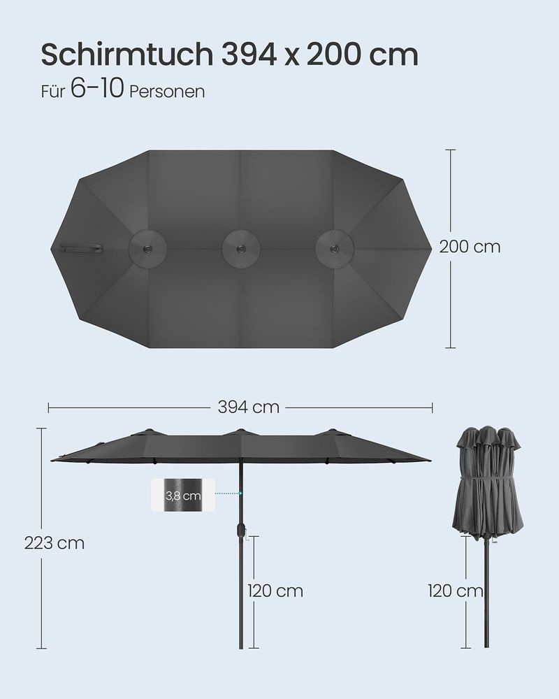 ✔ Ruim schaduwoppervlak – Met een afmeting van 394 x 200 cm is deze dubbele parasol ideaal voor tuinfeestjes, terrassen, cafés of openbare evenementen.
