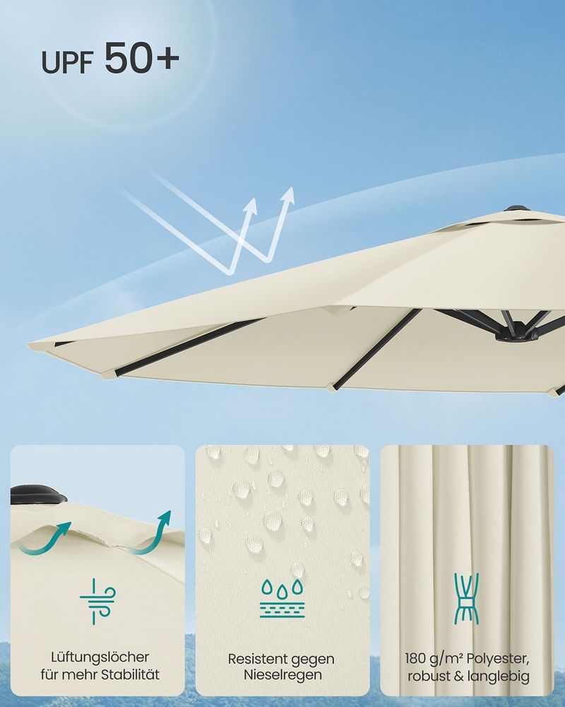 ✔ Bescherm je huid – Het parasoldoek biedt uitstekende UV-bescherming tot wel UPF 50+, houdt 98% van de schadelijke straling tegen en beschermt je huid zelfs op het heetst van de dag.