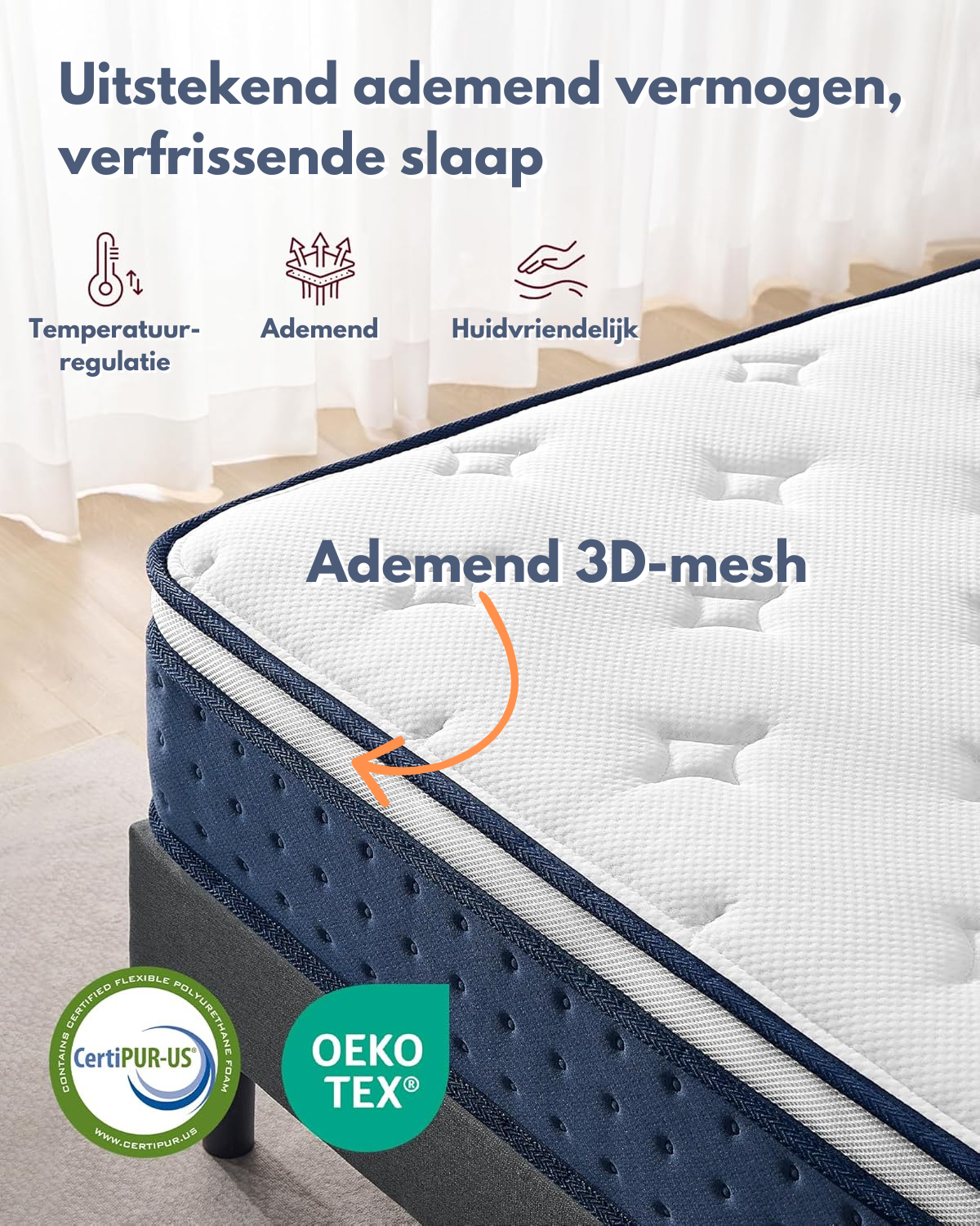 De gelmemorylaag voert overtollige warmte effectief af en zorgt voor een constante, verkoelende temperatuur tijdens de nacht. De ademende tijk en het 3D-mesh aan de zijkanten bevorderen luchtcirculatie, waardoor vocht en warmte snel worden afgevoerd.