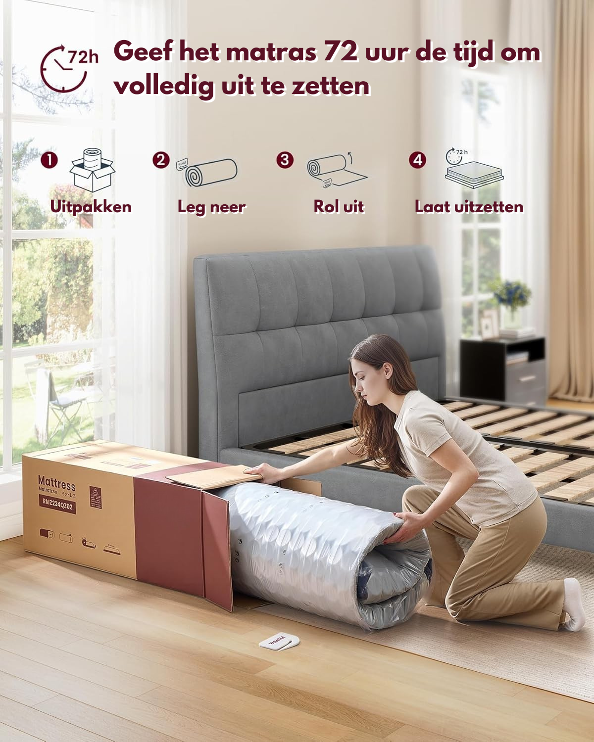 De matras wordt gerold en vacuüm verpakt geleverd, zodat je hem eenvoudig kunt vervoeren en uitpakken. Laat hem na het uitrollen 72 uur rusten om volledig zijn vorm aan te nemen — en geniet vervolgens van 30 nachten proefslapen om te ervaren hoe comfortabel hij echt is.