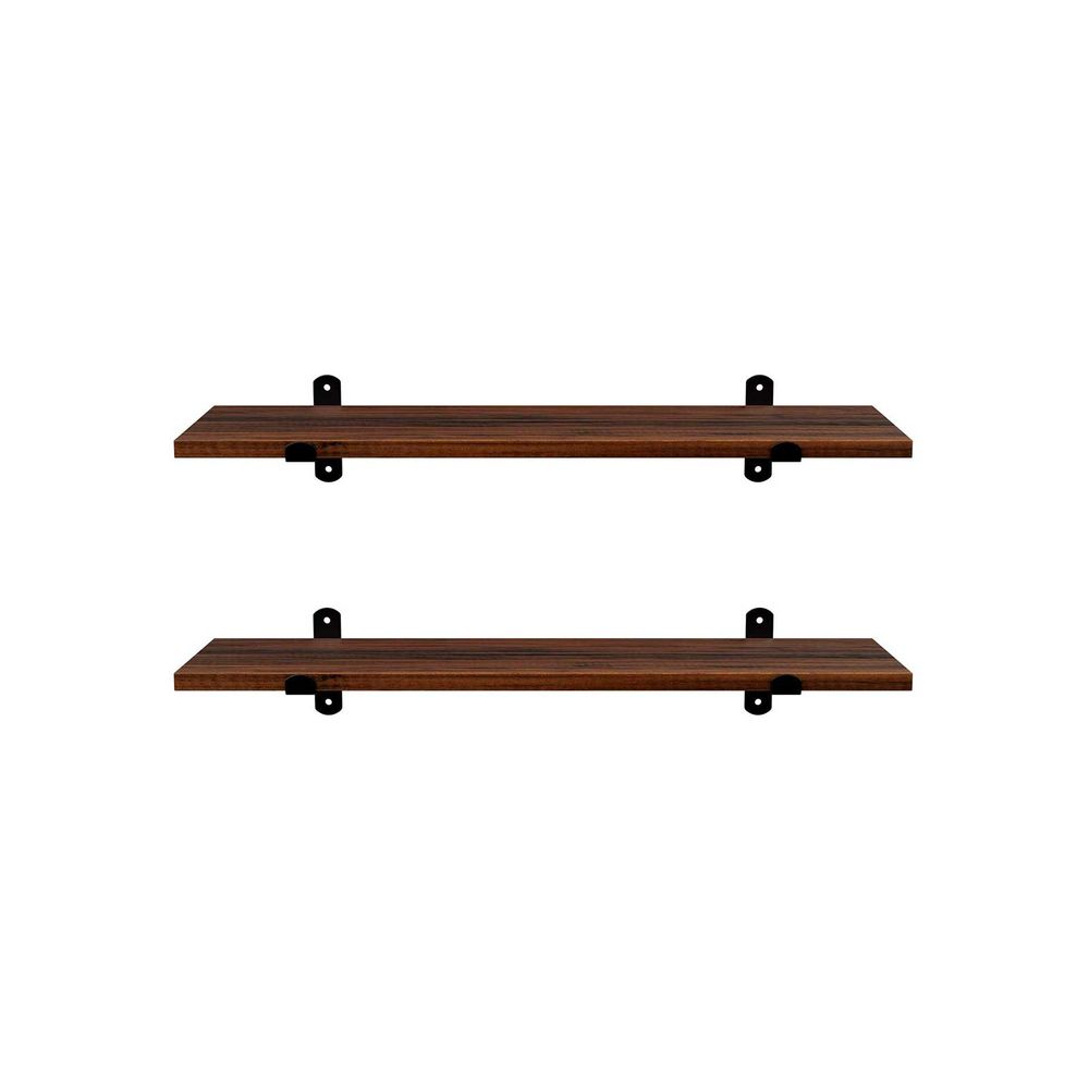 Geef lege muren een sfeervolle upgrade met deze set van 2 wandplanken in romantisch donkerbruin hout en een diepzwarte metalen beugel. Ideaal voor wie houdt van karakter en een warme stijl.
