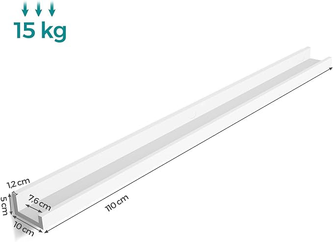 Deze zwevende wandplank van 110 cm is ontworpen om fotolijsten en decoraties stevig neer te zetten. De subtiele opstaande rand aan de voorkant voorkomt dat je foto’s wegglijden en houdt alles stabiel op zijn plek.